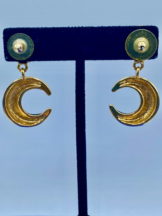 Gold Tone & Blue Enameled Crescent Moon Earrings