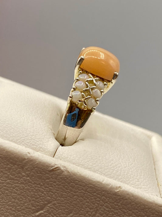 Sterling Silver Rhodium Flashed Square Cabochon Beige Stone Opal Accents Ring