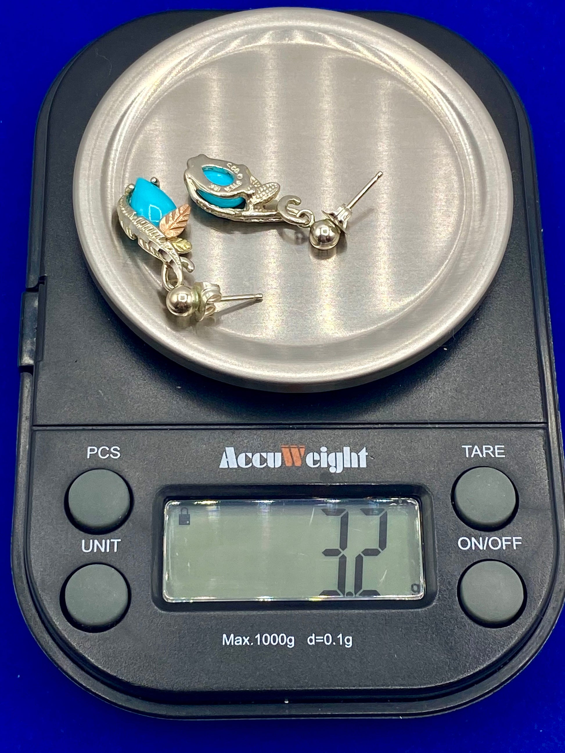 These Black Hills Gold Sterling Silver & 12K Turquoise Leaf Dangle Earrings are expertly crafted and weigh only 3.2 grams, ensuring comfort for all-day wear. The elegant leaf design, adorned with 12K Turquoise gems, measures .75 inches long for a subtle yet striking look. Perfect for any occasion, these earrings add a touch of sophistication to any outfit.