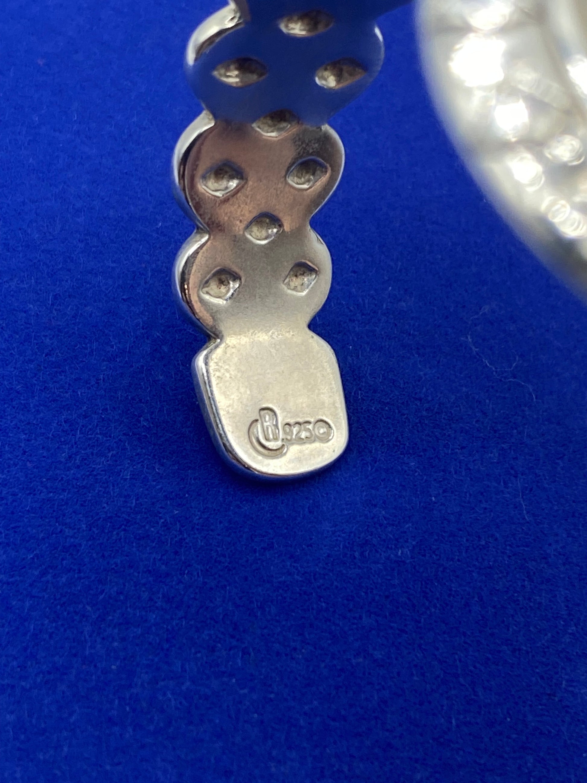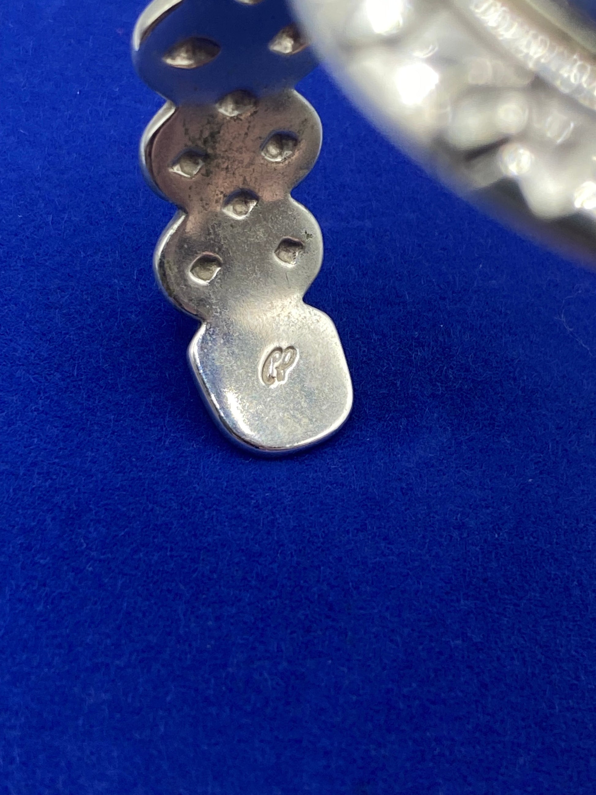 This Carolyn Pollack Sterling Silver Cuff Bracelet features lapis and mother of pearl inlays, weighing 50.1 grams and in a size 5.5. Enhance your look with the elegance of natural gemstones and the expert craftsmanship of Carolyn Pollack. A truly stunning addition to any jewelry collection.