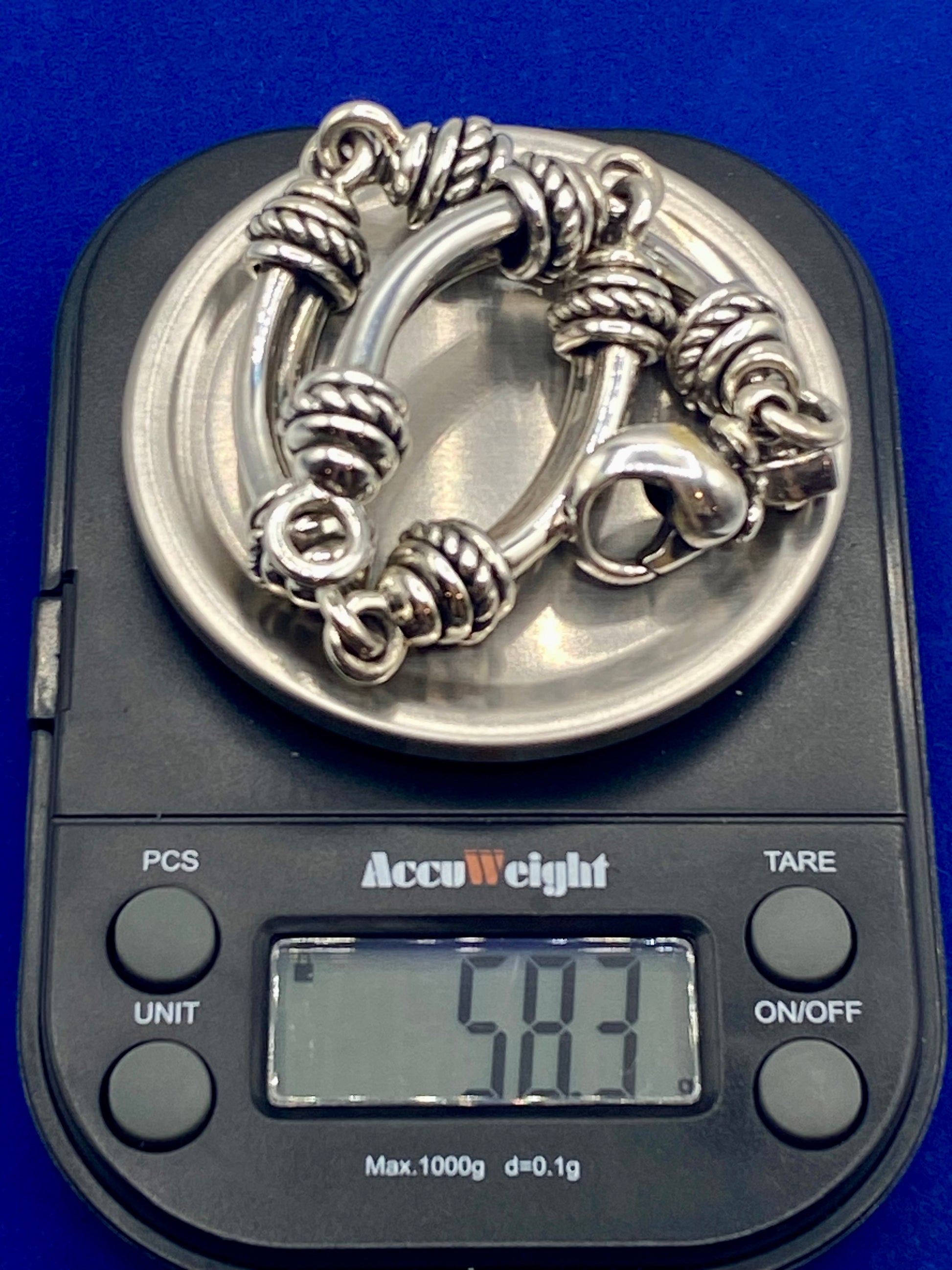Expertly crafted by David Wysor, this Heavy Sterling Silver Link Bracelet boasts a weight of 58.3 grams and a 7 inch length. Made with high-quality materials, this bracelet is both stylish and durable, making it a valuable addition to any jewelry collection.