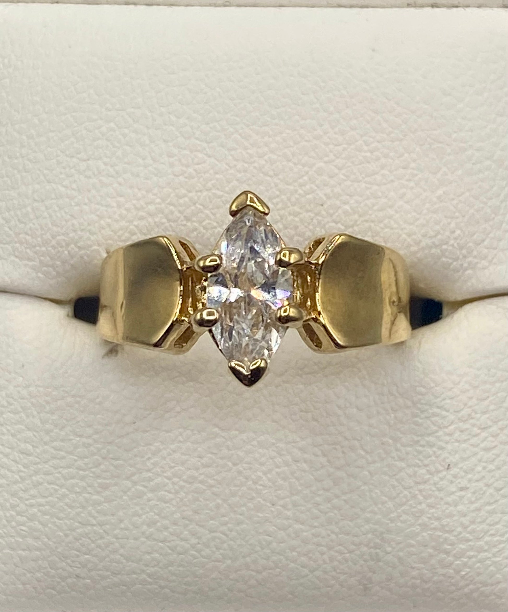This Gold Tone Marquise Cut Ring, size 7, adds an elegant touch to any outfit. With its unique marquise cut and high quality gold tone, it exudes sophistication and style. Upgrade your jewelry collection with this timeless piece.