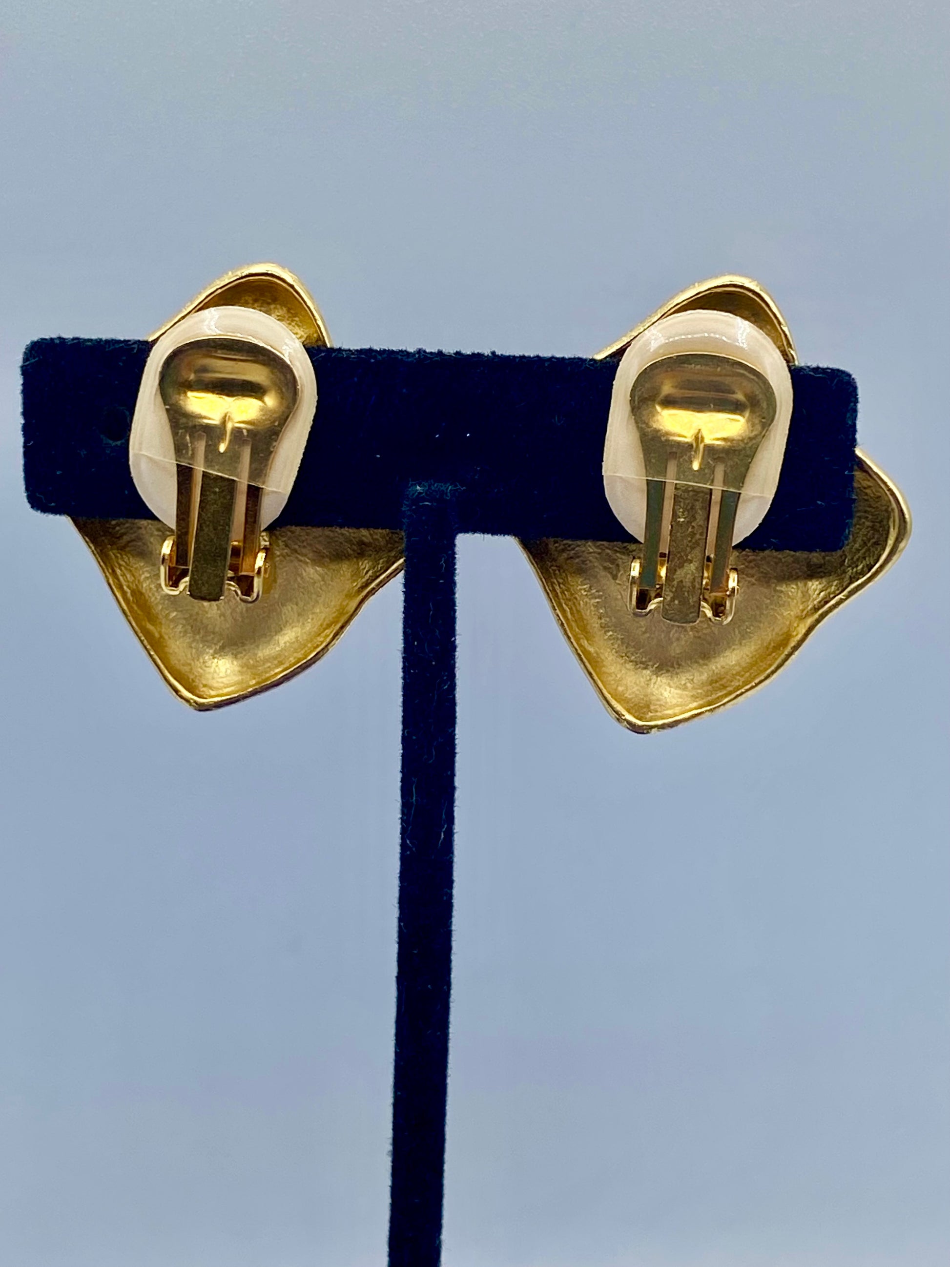 These Gold Tone Statement Square Clip Ons are a bold and elegant addition to any outfit. Measuring 1.25 inches long, they are marked GIO and feature comfortable ear pads. The perfect choice for a sophisticated and stylish look.