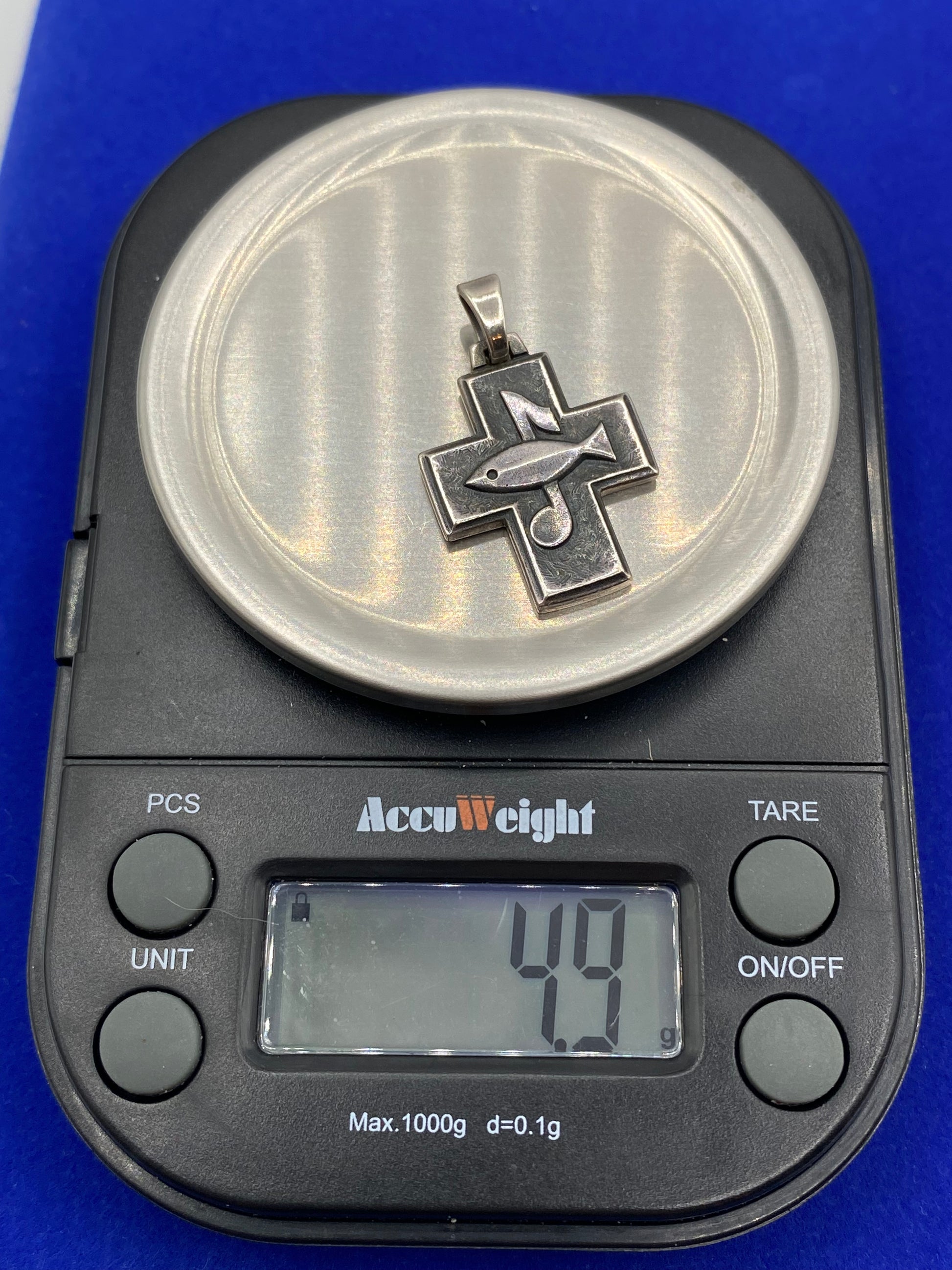 The pendant is about an inch long and weighs about 4.9 grams.
