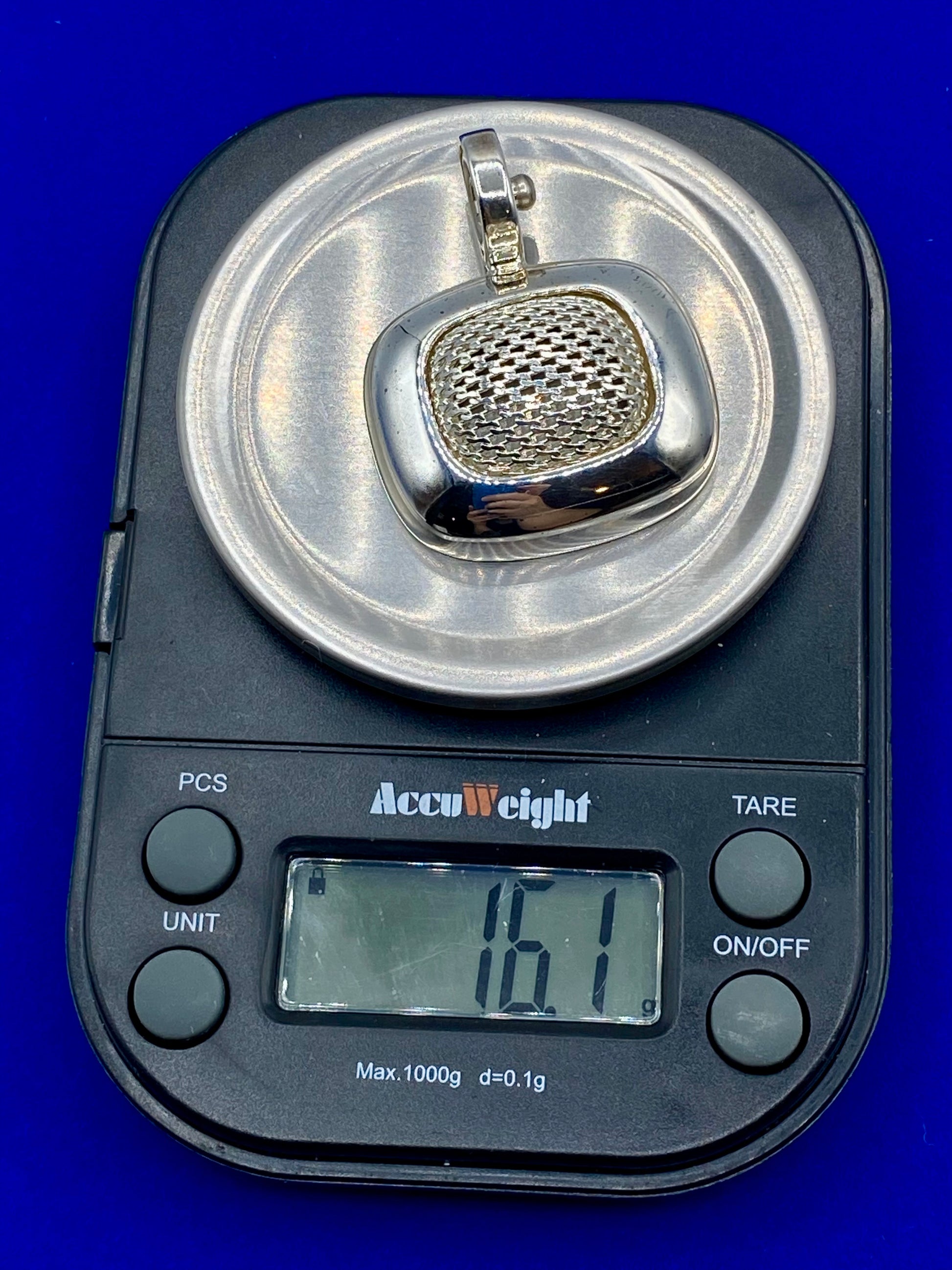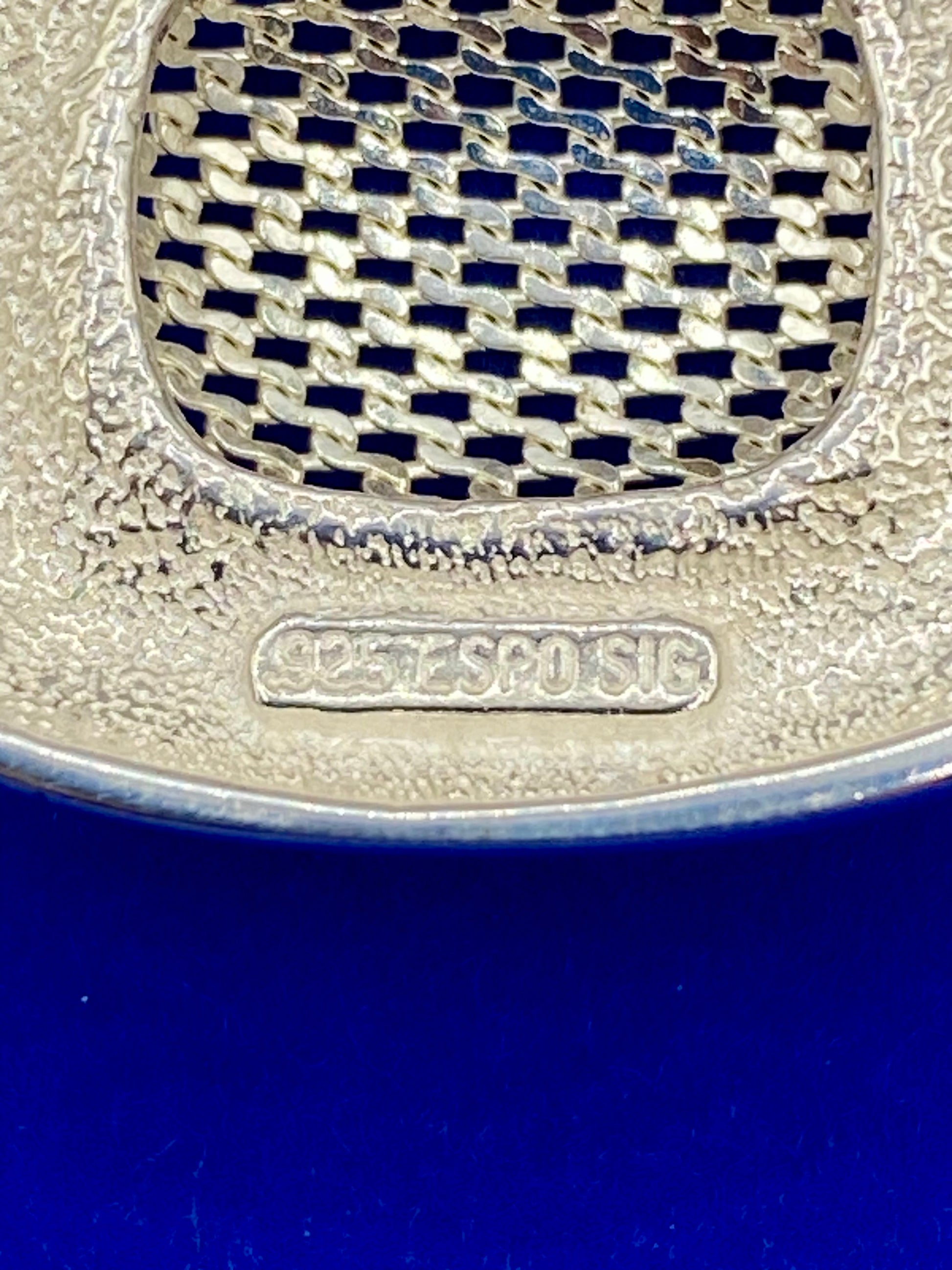 Introducing the Joseph Esposito ESPO Sterling Silver Mesh Snap Pendant. Expertly crafted from 16.1 grams of stunning sterling silver, this elegant pendant measures 1.5 inches long. The unique mesh snap design adds a touch of sophistication to any outfit. Elevate your style with this luxurious statement piece.