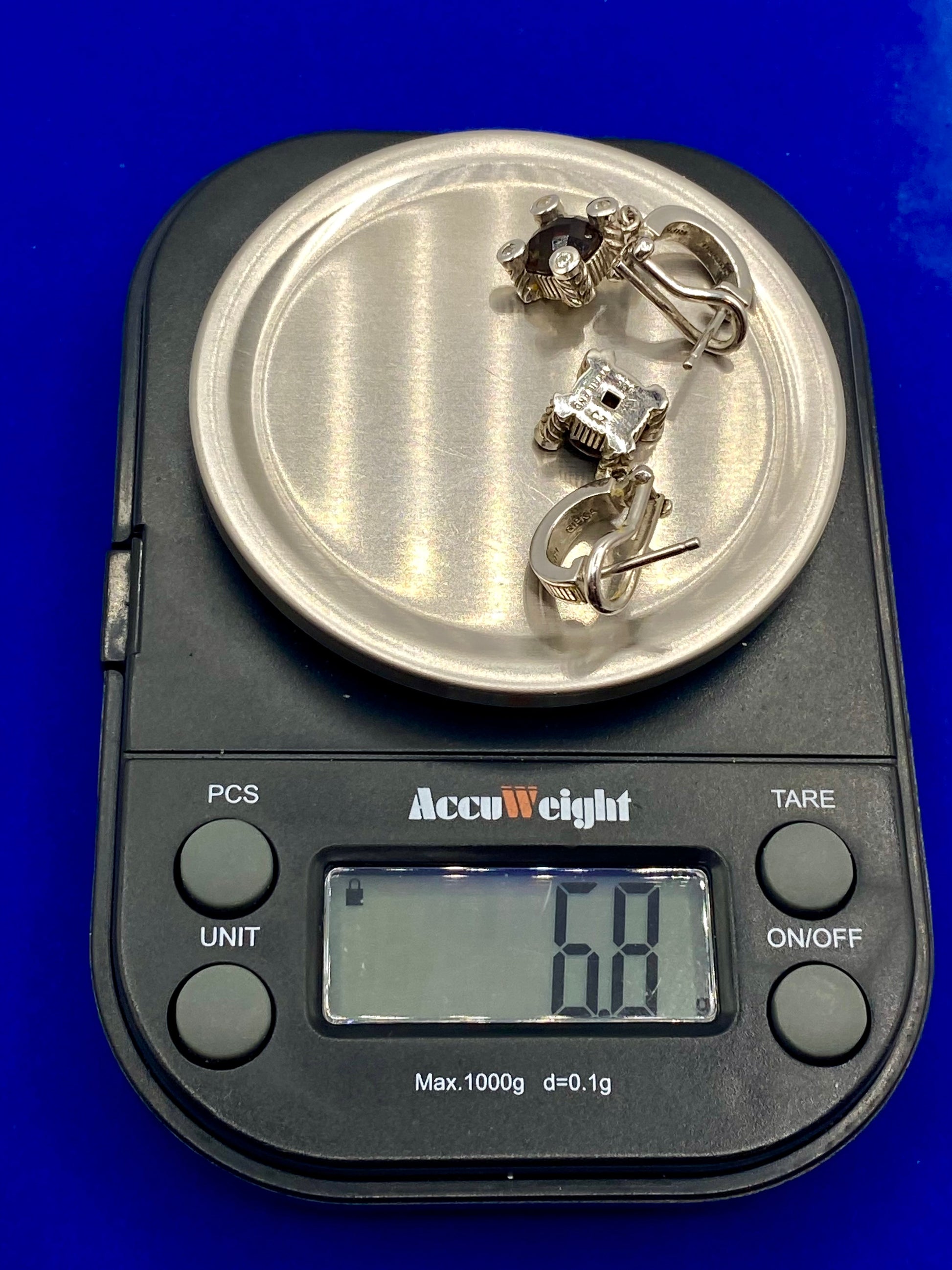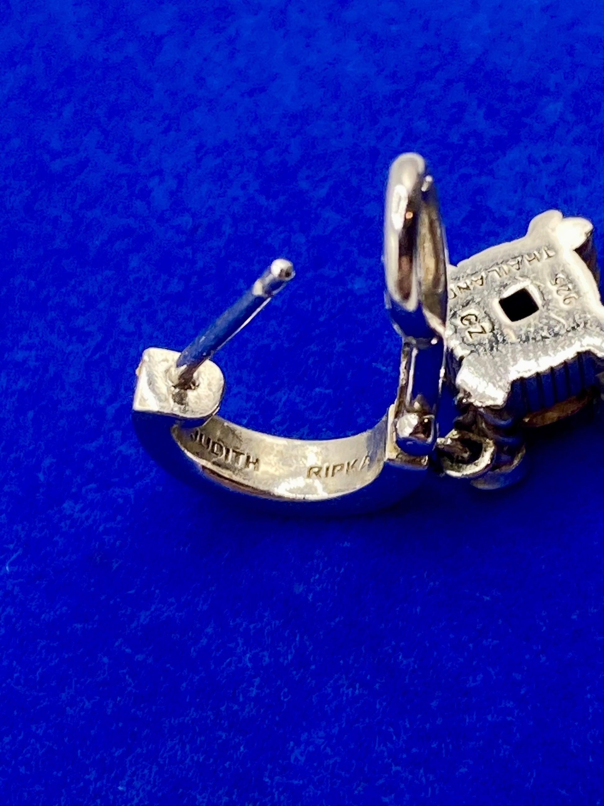 Expertly designed by Judith Ripka, these Sterling Silver Smokey Topaz CZ Hoop Dangle Earrings weigh 6.8 grams and measure an inch long. Elevate your style with the elegance of these stunning earrings, featuring the perfect combination of precious materials and exquisite craftsmanship.