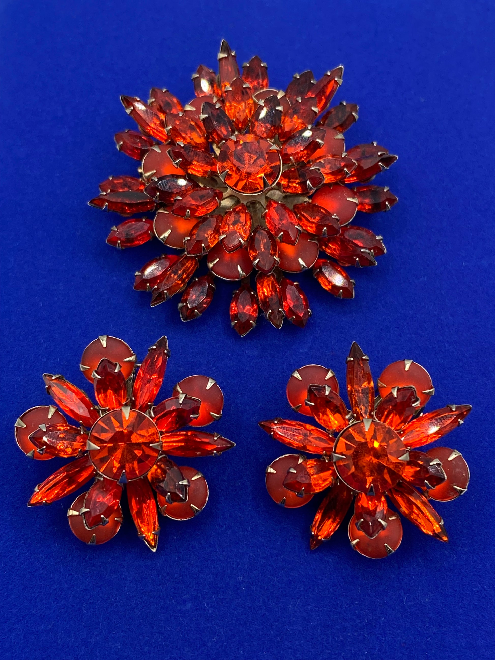 MCM Orange Rhinestone Floral Brooch Earrings Set