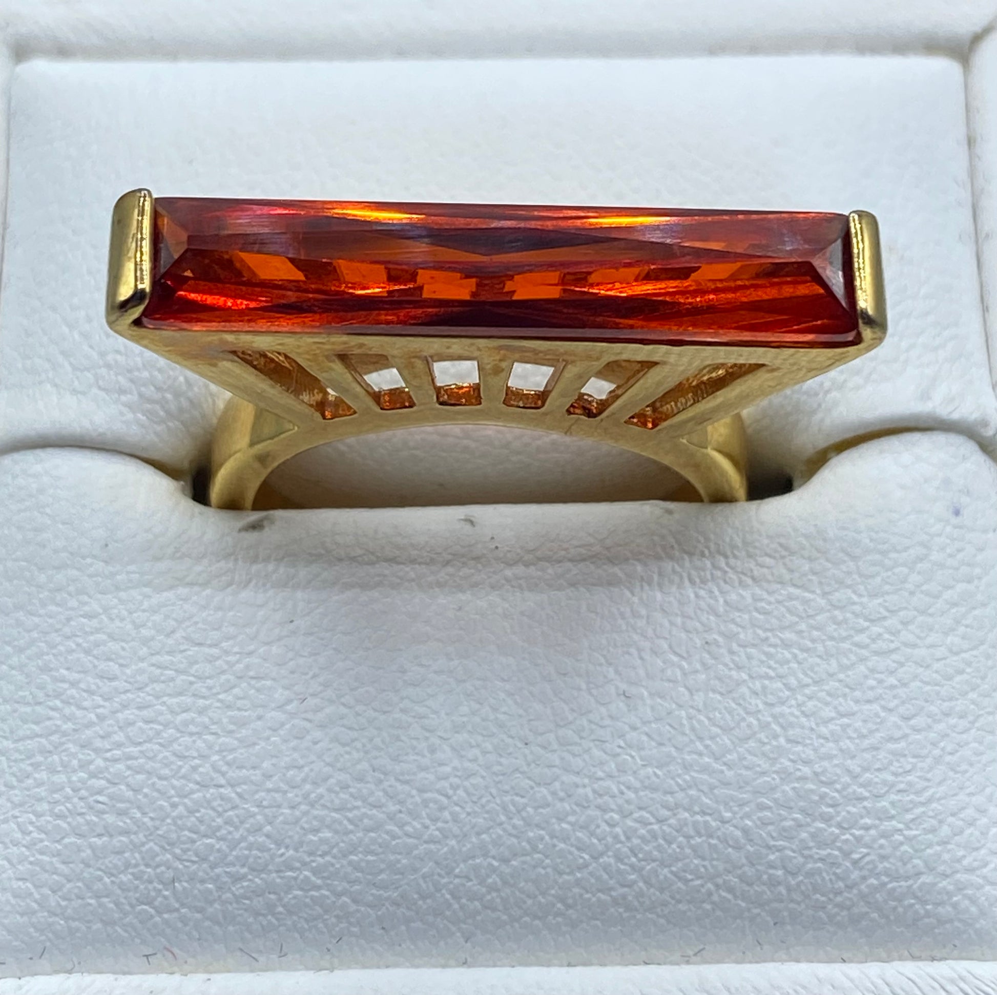 This Orange Glass Gold Tone Ring in size 8 offers a touch of elegance with its vibrant orange glass and luxurious gold tone. Crafted with attention to detail, this ring is perfect for adding a pop of color to any outfit. Make a statement with this stunning piece that is sure to impress.