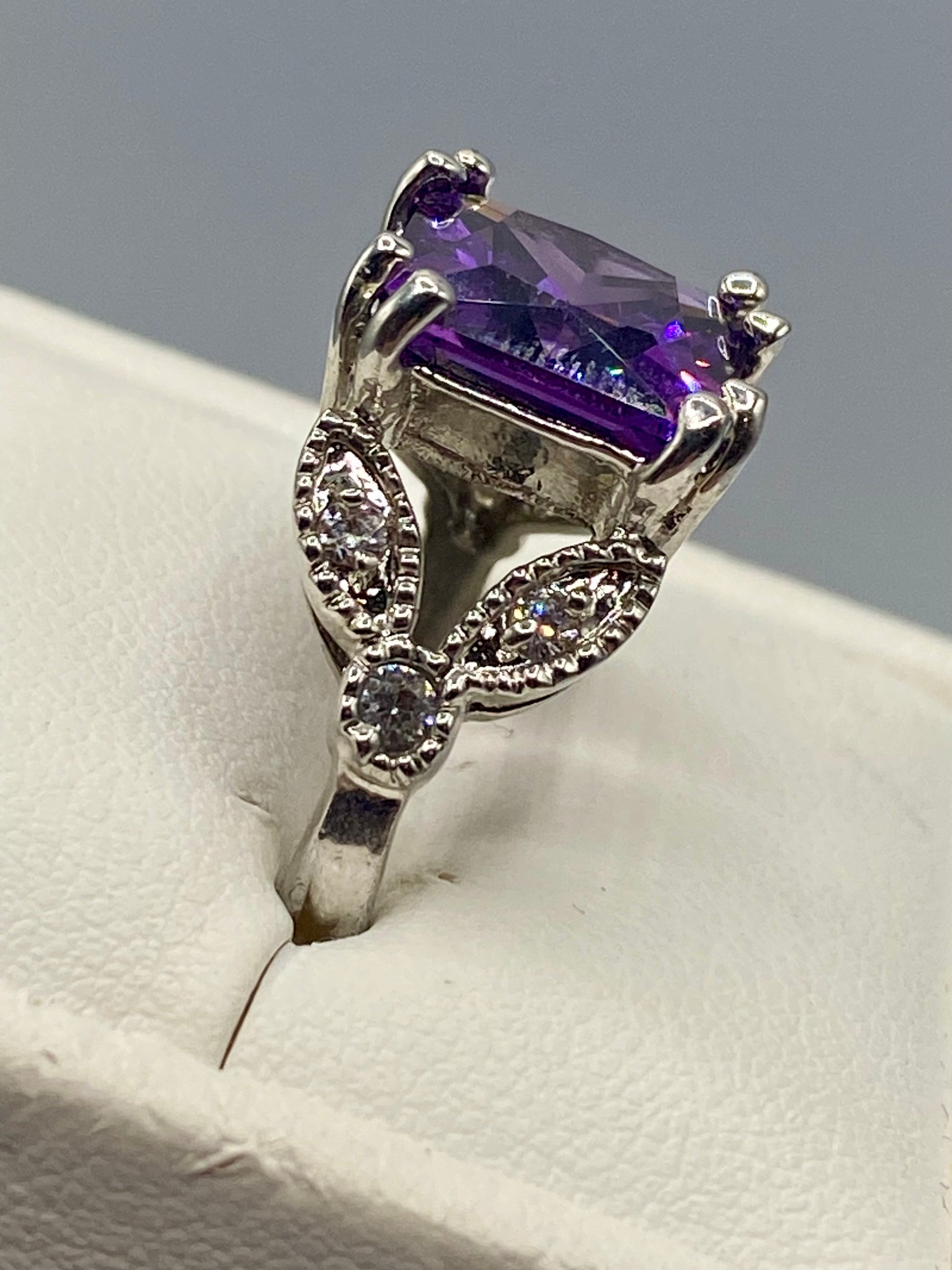 Add a pop of color to your style with our stunning Purple Glass Silver Tone Ring. Crafted with a beautiful purple glass stone and intricate silver tone design, this ring is sure to make a statement. Available in size 9 for the perfect fit. Elevate your look with our elegant ring.
