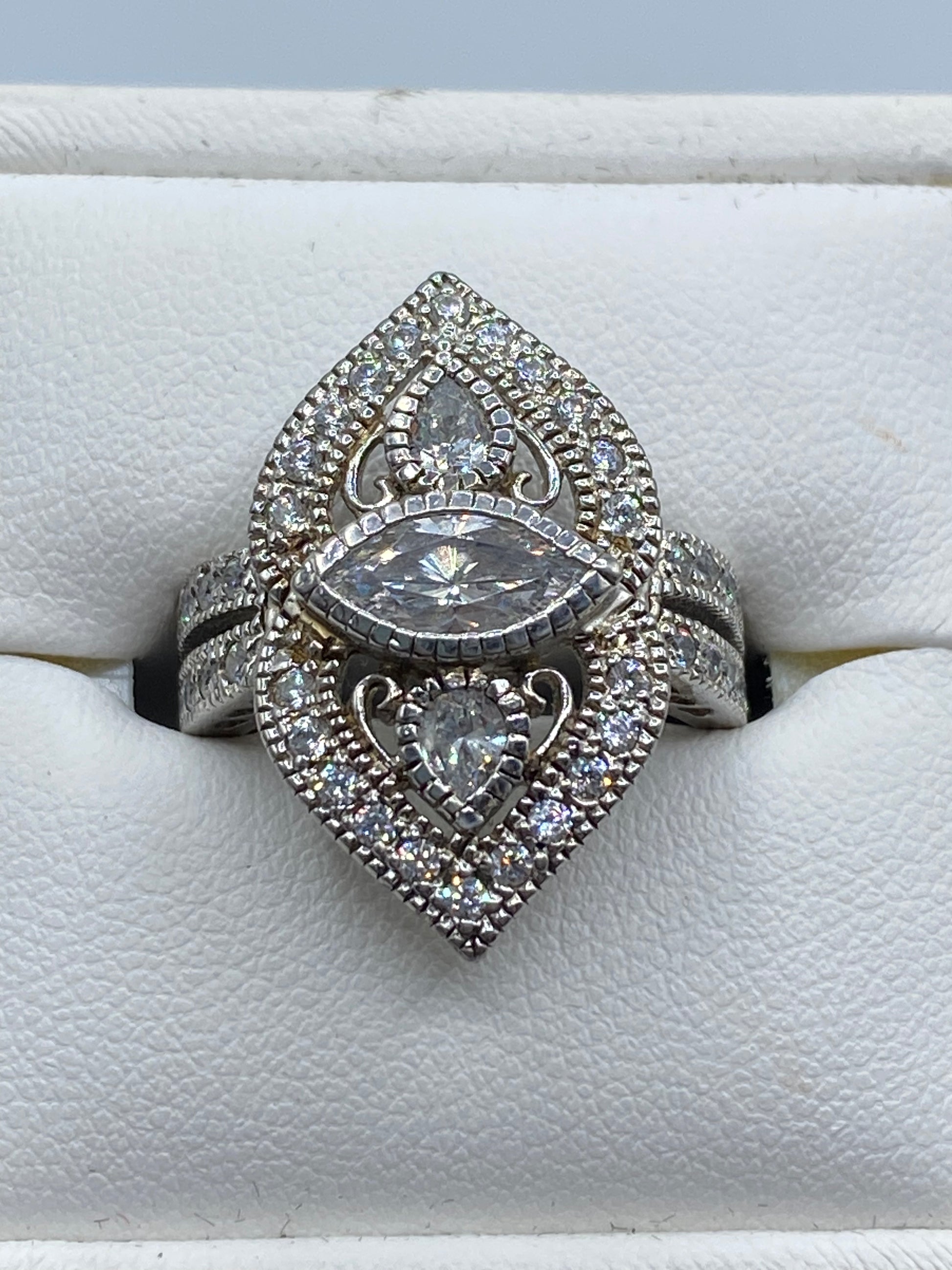 Expertly crafted from high-quality sterling silver, this Ross Simmons ring features a stunning cubic zirconia stone that sparkles in the light. With its timeless design and perfect size 7.5 fit, this ring is the perfect addition to any jewelry collection. Elevate any outfit with this beautiful and sophisticated piece.