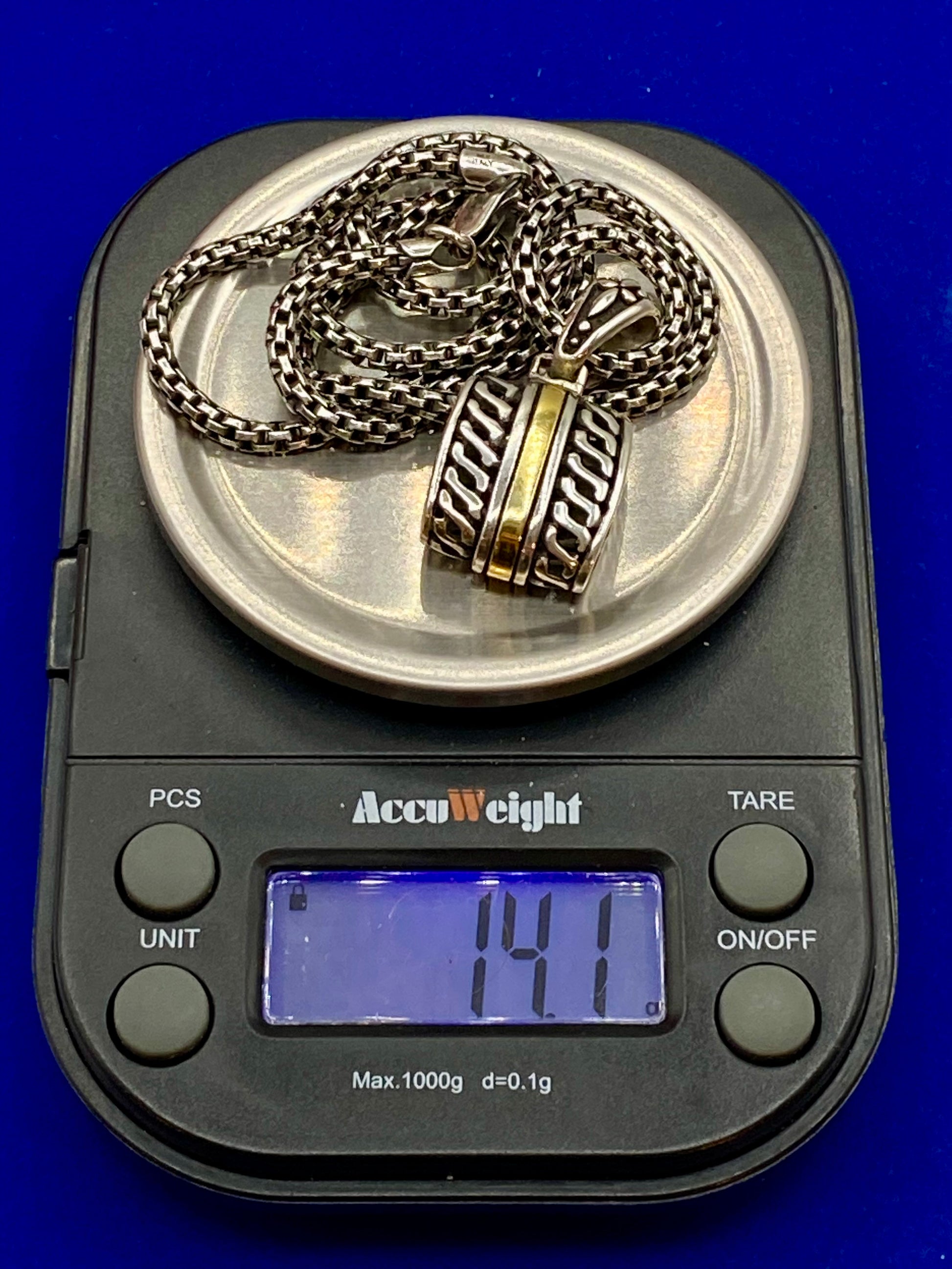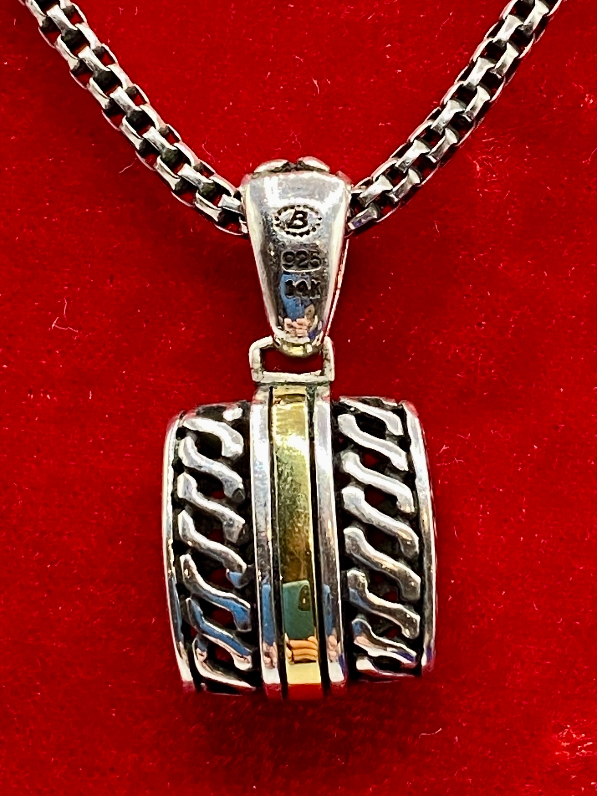 This stunning necklace features an ornate rectangular pendant crafted from sterling silver and 14K gold. Weighing in at 14.1 grams, this necklace is substantial yet elegant. The 16-inch length is perfect for everyday wear, making it a versatile and timeless addition to any jewelry collection.