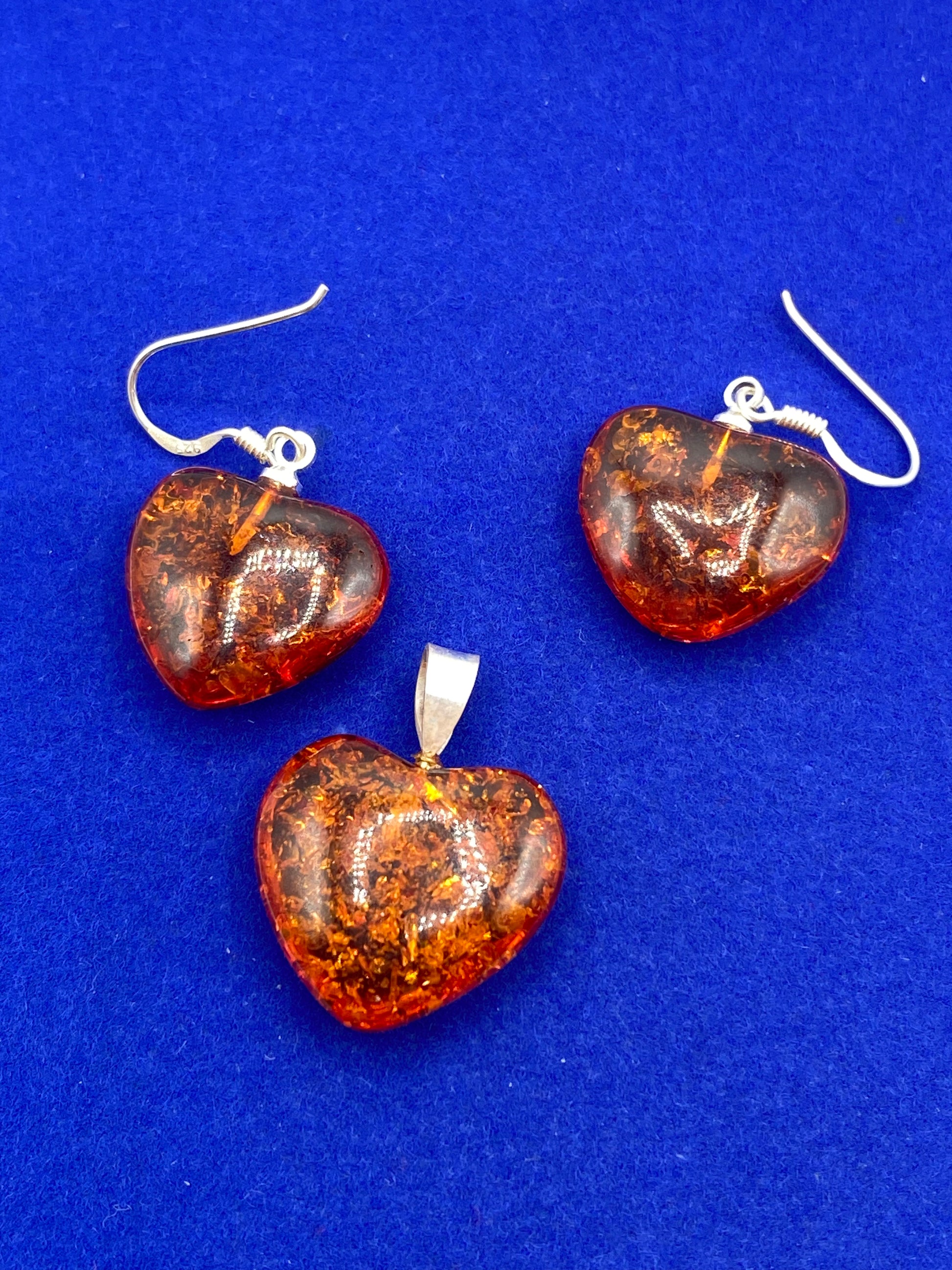 Elevate any outfit with our stunning Sterling Silver Amber Heart Jewelry Set. Skillfully crafted with high-quality sterling silver and genuine amber stones, this set features a beautiful heart-shaped pendant and earrings for a timeless and elegant look. Perfect for any occasion and sure to dazzle with its unique and alluring design.