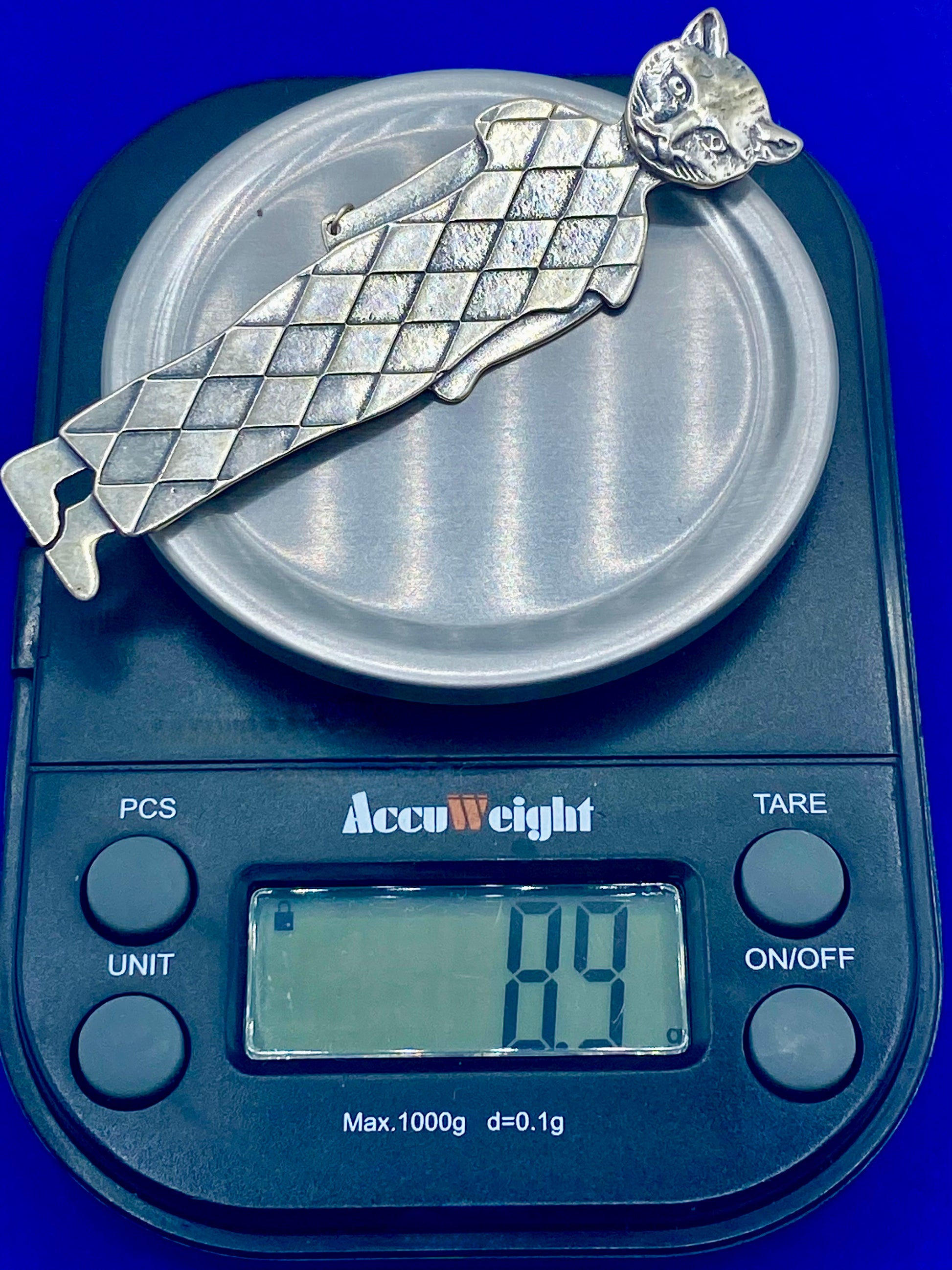 This Sterling Silver Artisan Cat Person Brooch is a must-have for any cat lover. The beautifully crafted 3-inch brooch is made of high-quality sterling silver, weighing 8.9 grams. Show off your love for felines with this unique accessory that is sure to catch everyone's eye.