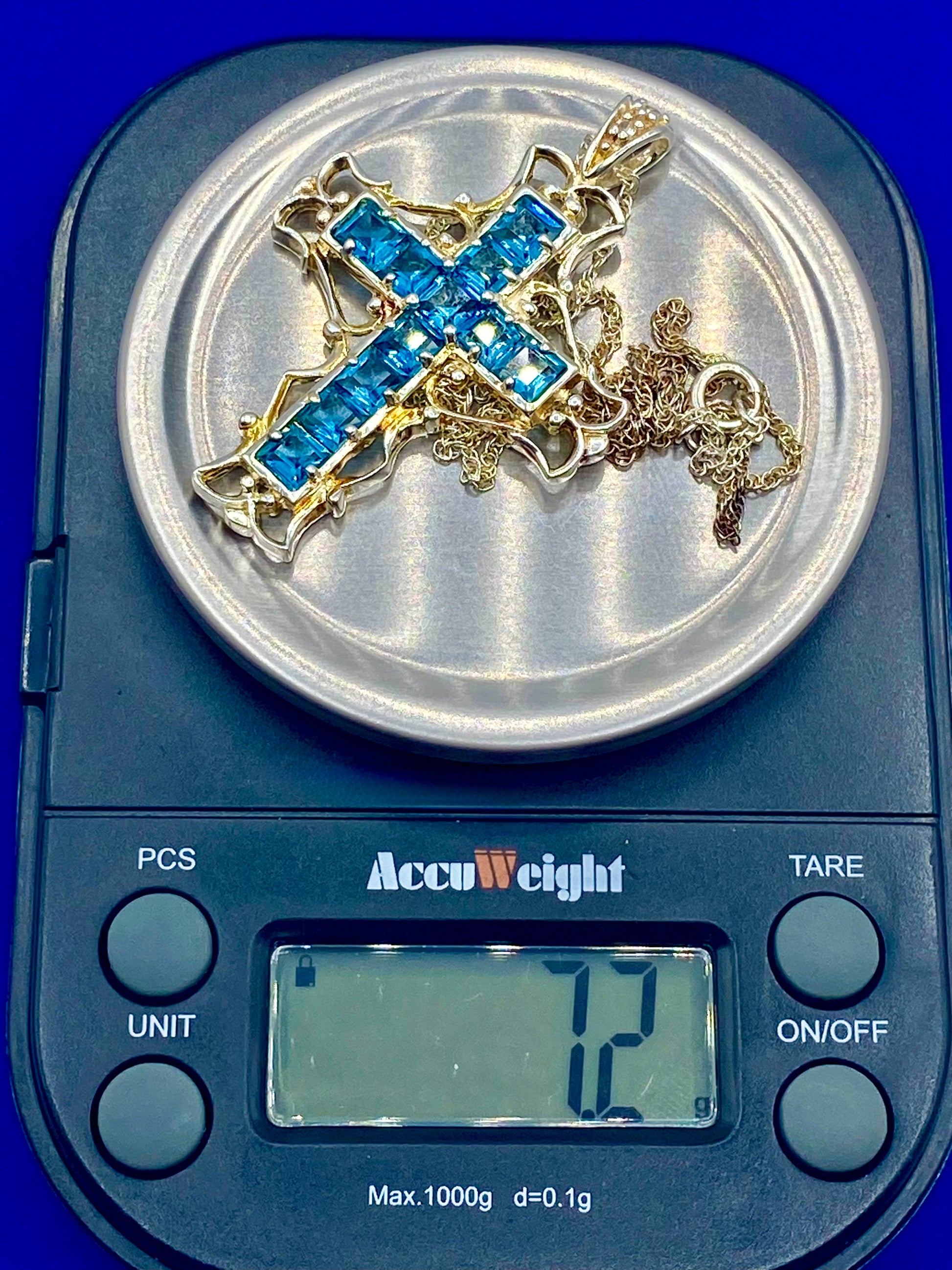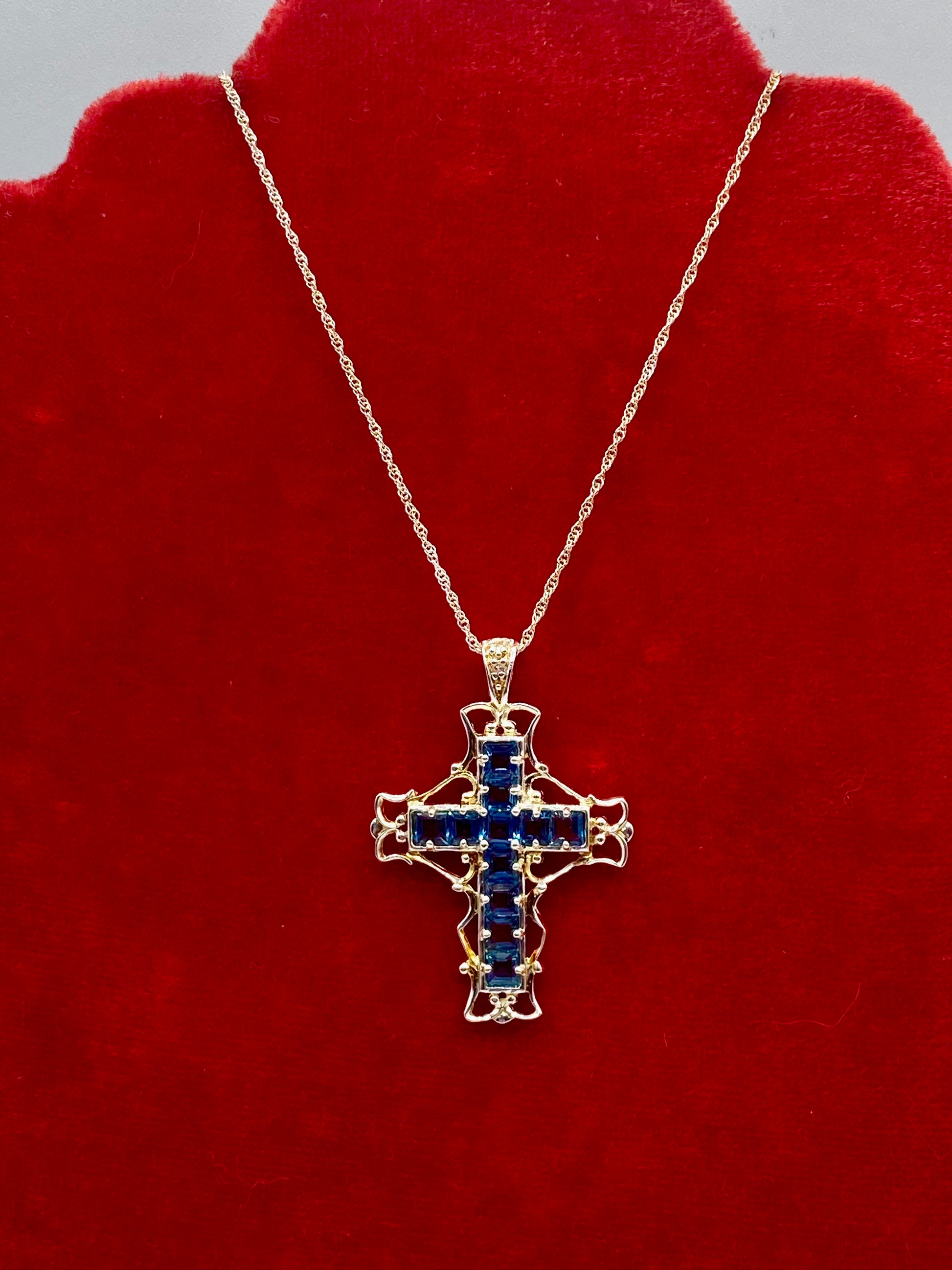 Expertly crafted in shimmering sterling silver, this stunning Blue Topaz Cross Necklace is the perfect combination of elegance and faith. The necklace weighs 7.2 grams and measures 18 inches long, making it a lightweight yet impactful piece. Show off your devotion in style with this beautiful necklace.