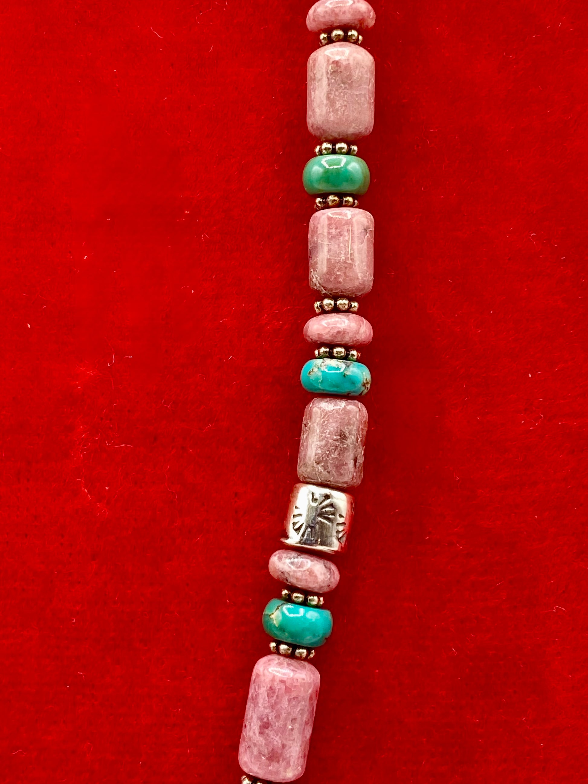 Expertly crafted by Carolyn Pollack, this stunning necklace features a combination of rhodonite and turquoise stones set in sterling silver. With a length of 14 inches and an additional 2 inch extender chain, this necklace weighs 37.9 grams. Elevate your style with this beautiful and unique piece.