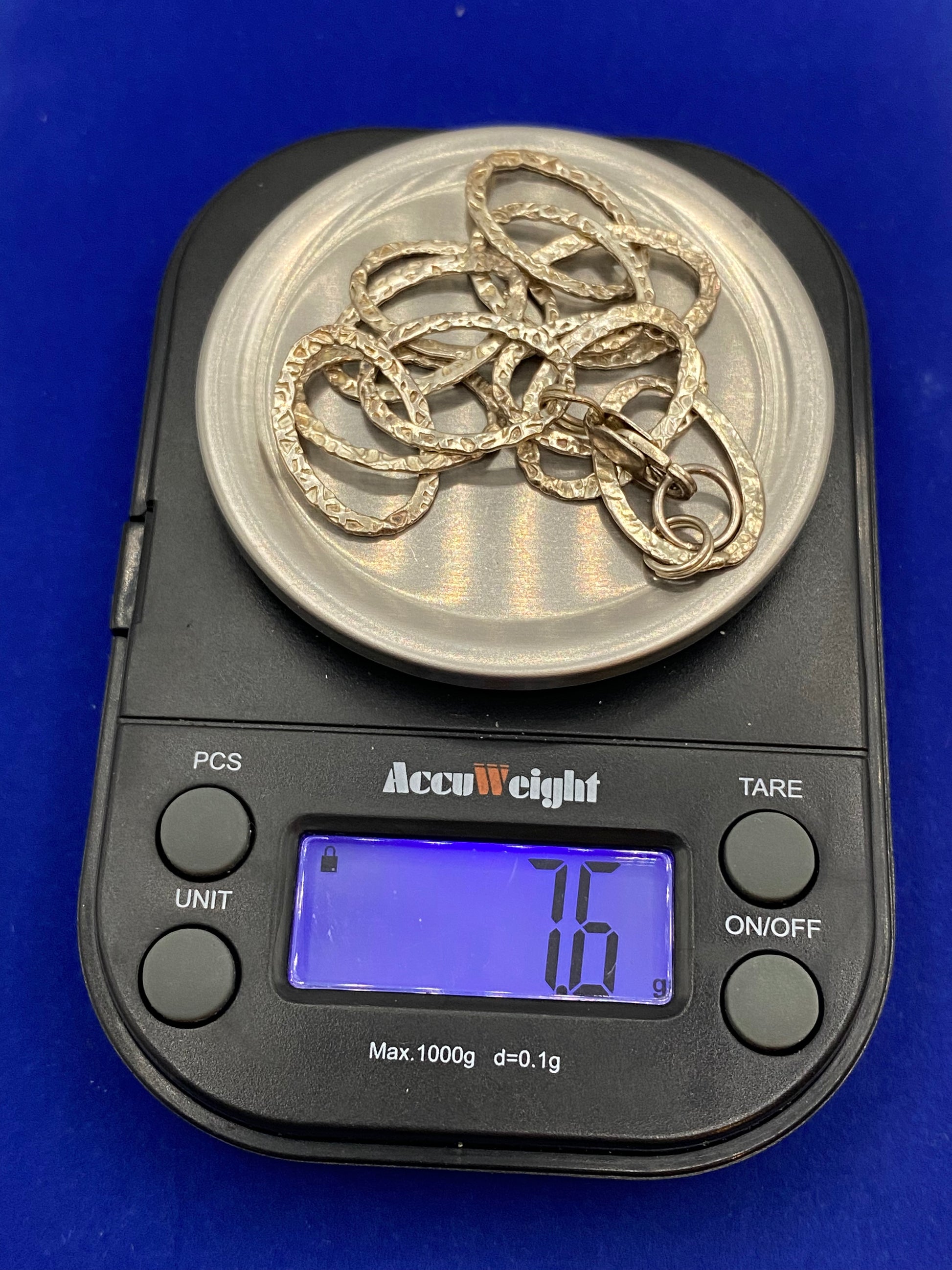 The bracelet is about 8 inches long and weighs about 7.6 grams.