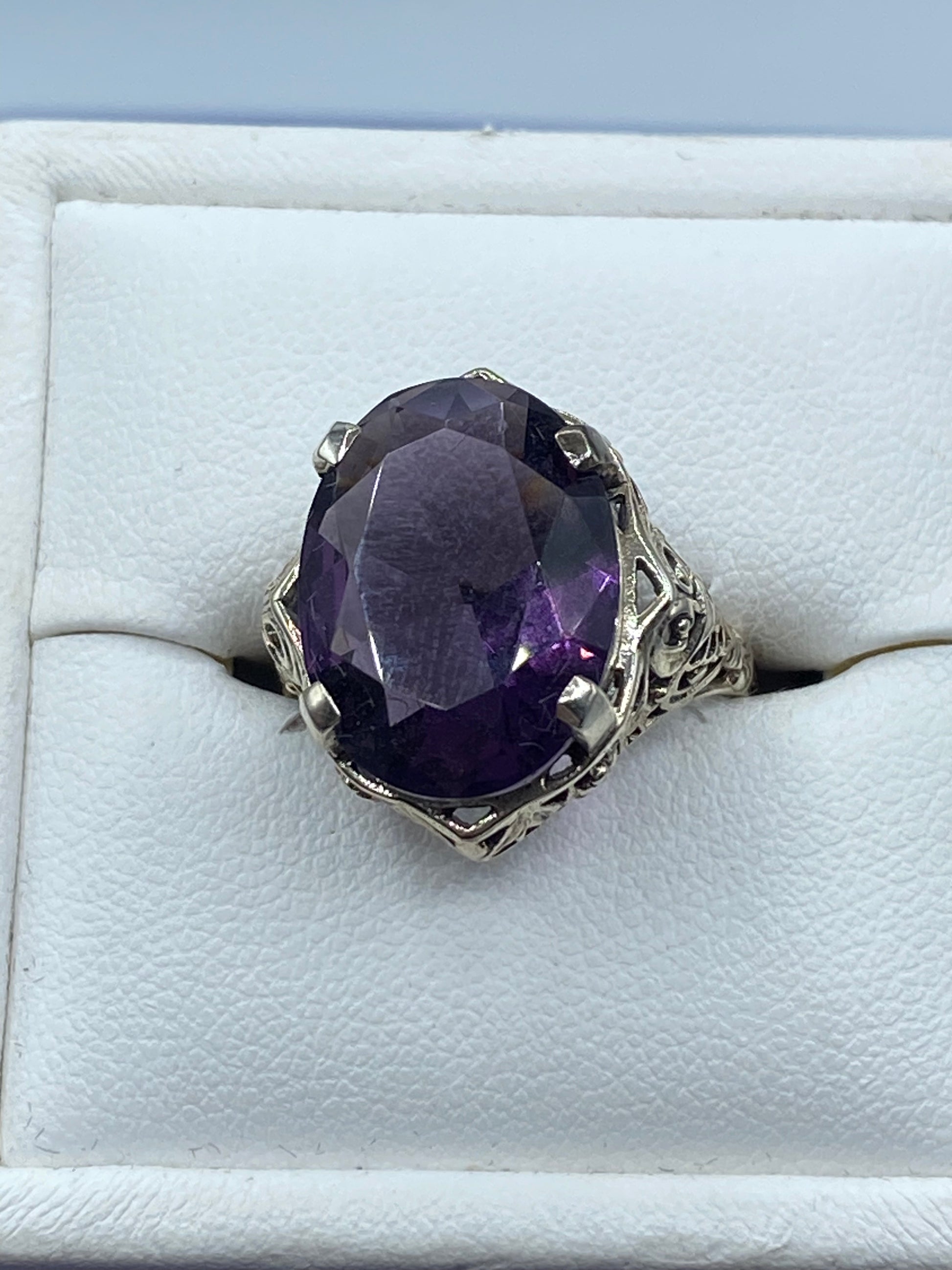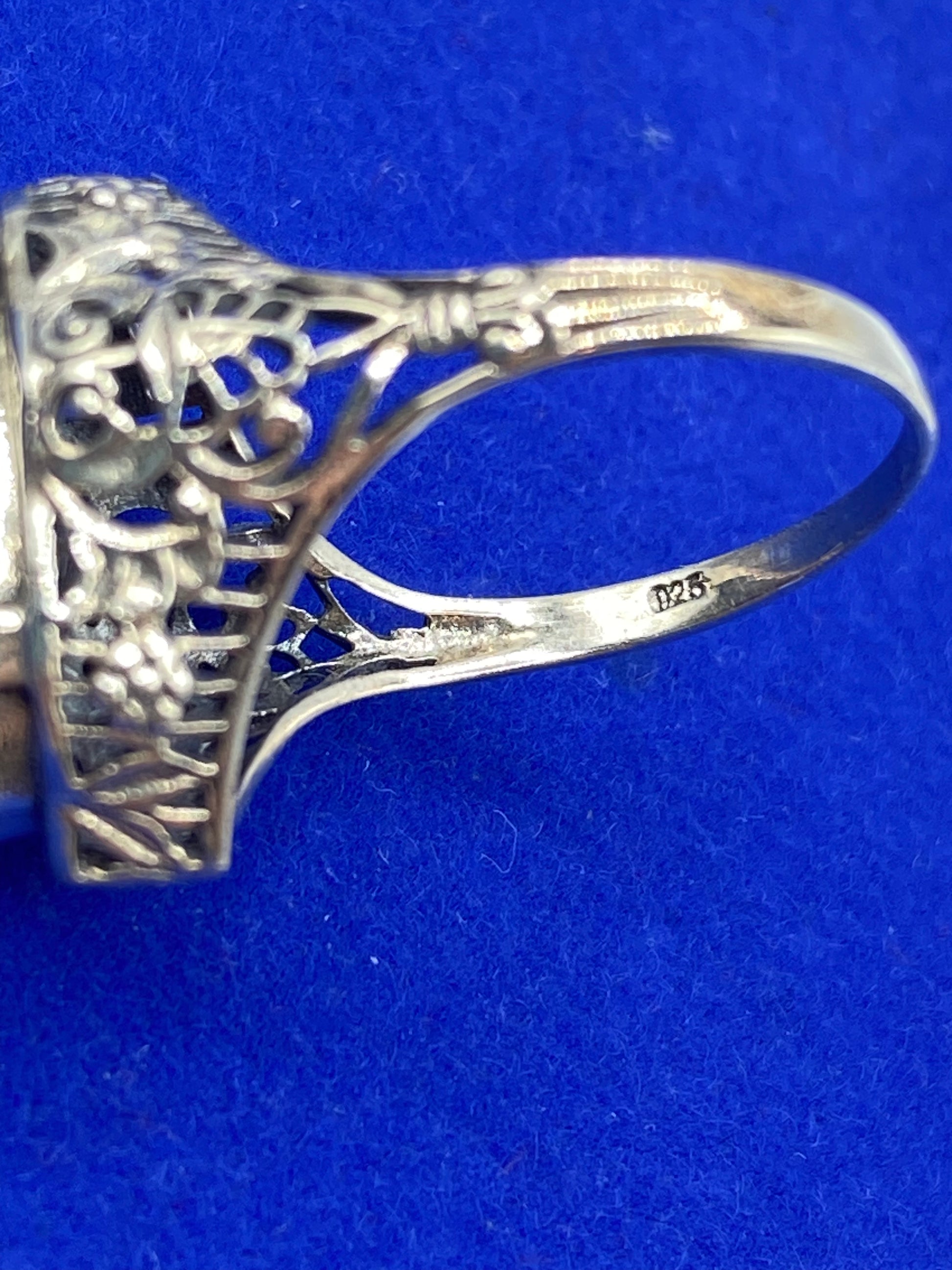 Crafted from high-quality sterling silver, this Deco style ring adds a touch of timeless elegance to any outfit. With its delicate details and marked "925" stamp, it's the perfect addition to your jewelry collection. Available in size 7.5 for a comfortable and stylish fit.