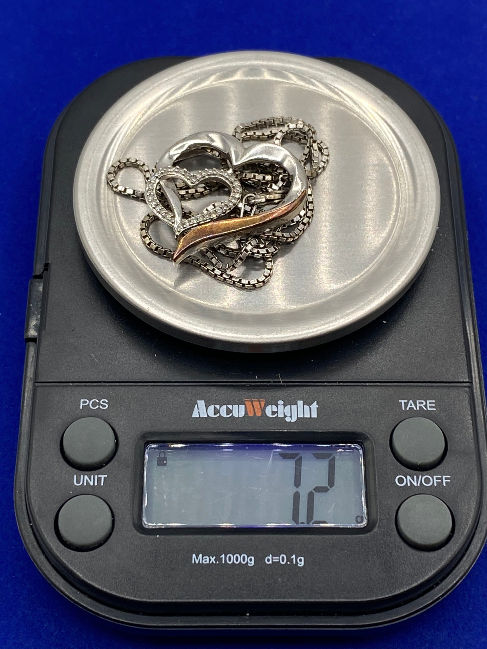 The necklace is about 16 inches long and weighs about 7.2 grams.