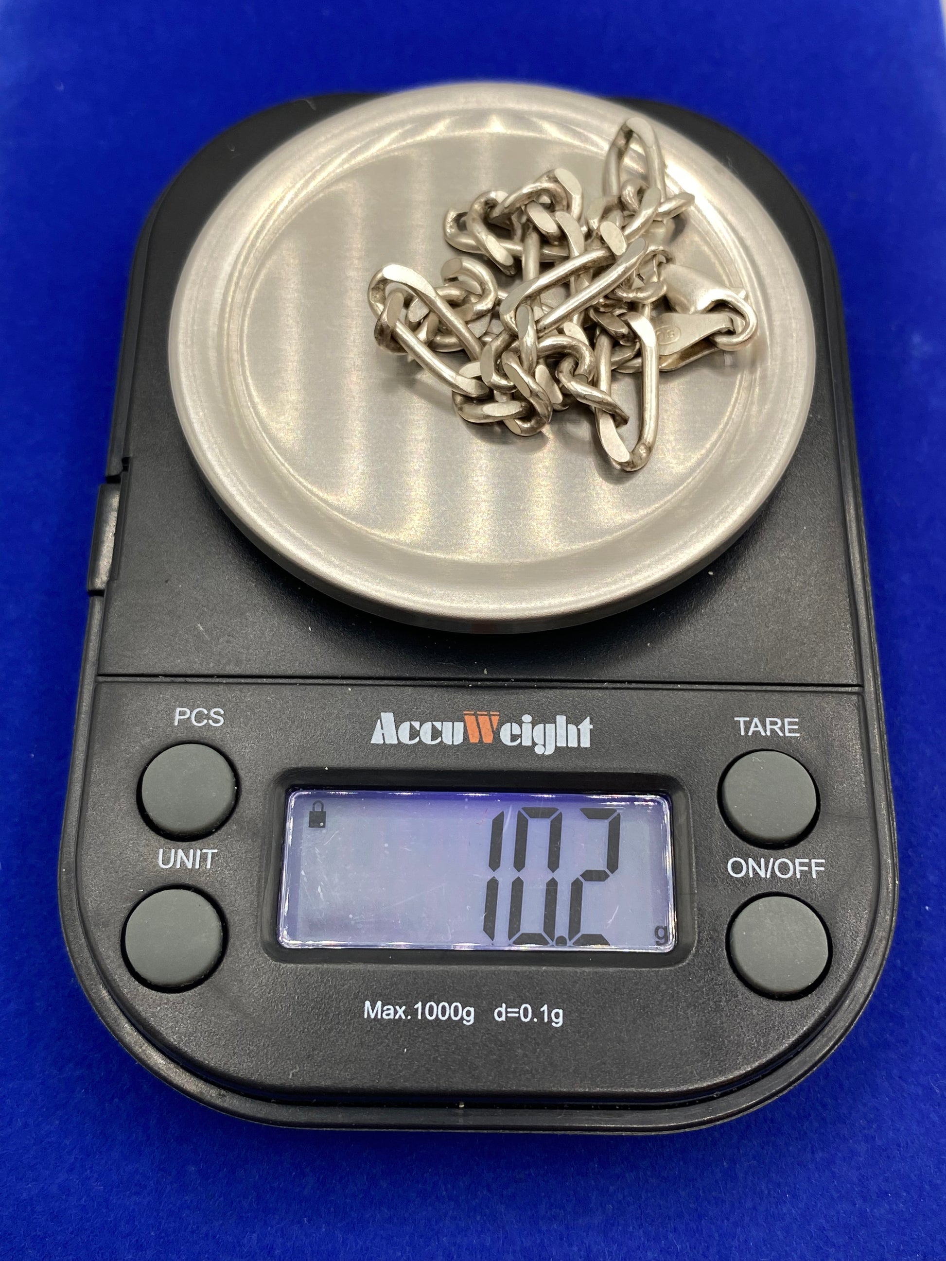 The bracelet is about 8 inches long and weighs about 10.2 grams.