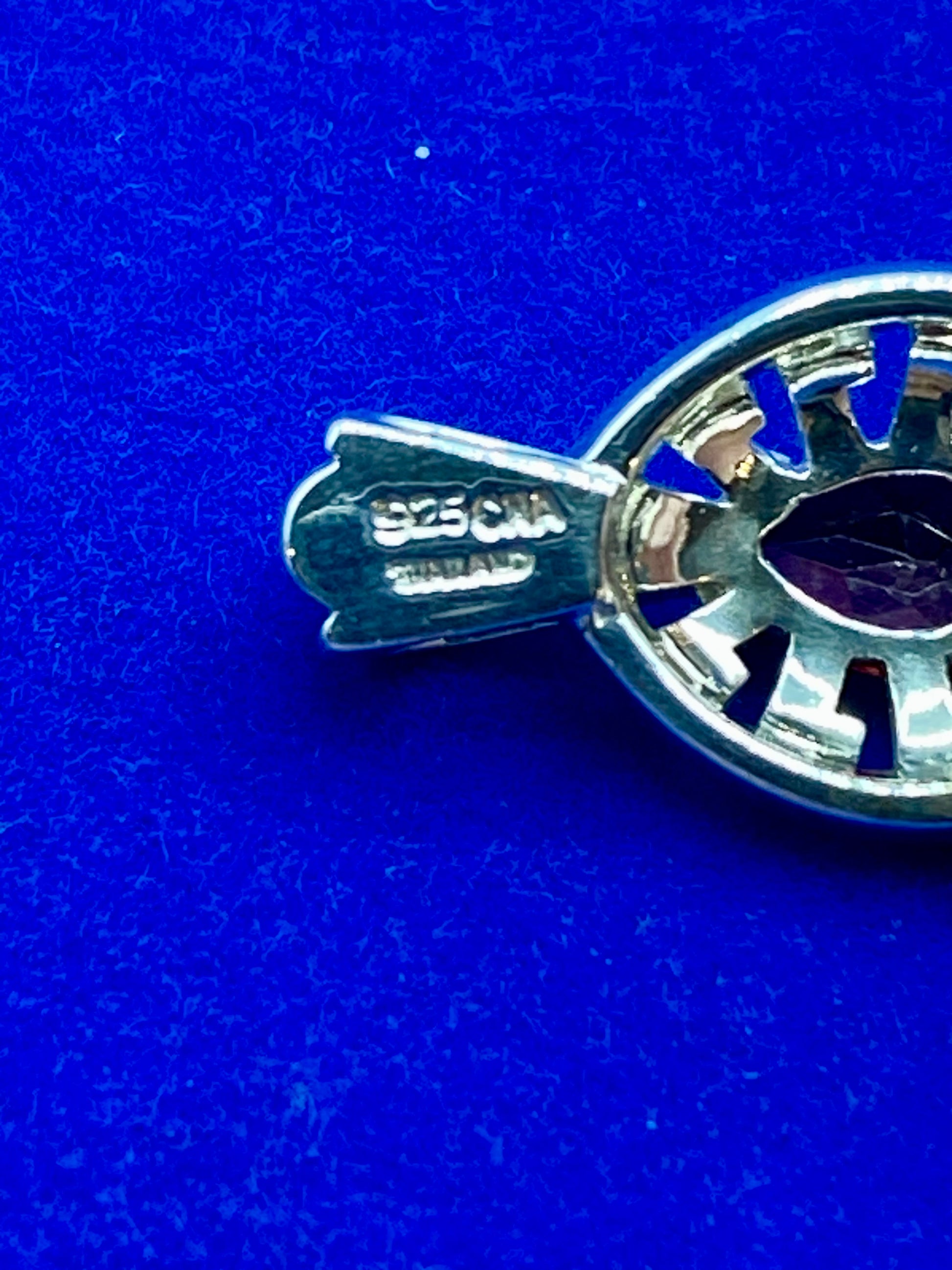 Crafted from high-quality sterling silver, this elegant pendant features a stunning garnet gemstone. At just 2.7 grams and .5 inches long, it is lightweight and versatile, making it the perfect addition to any outfit. Elevate your style with the timeless beauty of this Sterling Silver Garnet Pendant.