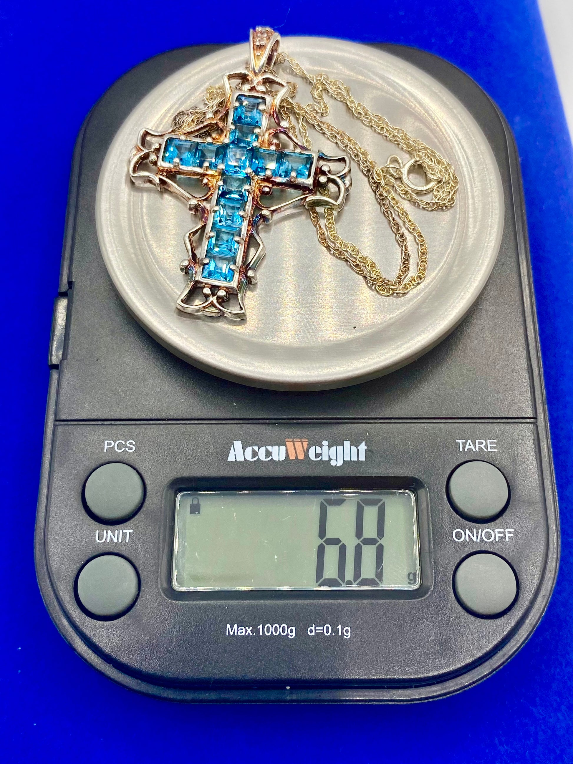 -Expertly crafted in Sterling Silver, this Light Blue Square Topaz Cross Necklace adds a touch of elegance to any outfit. With a length of 18 inches and a weight of 6.8 grams, it is lightweight yet durable. The light blue hue of the topaz stones adds a pop of color to the classic cross design.