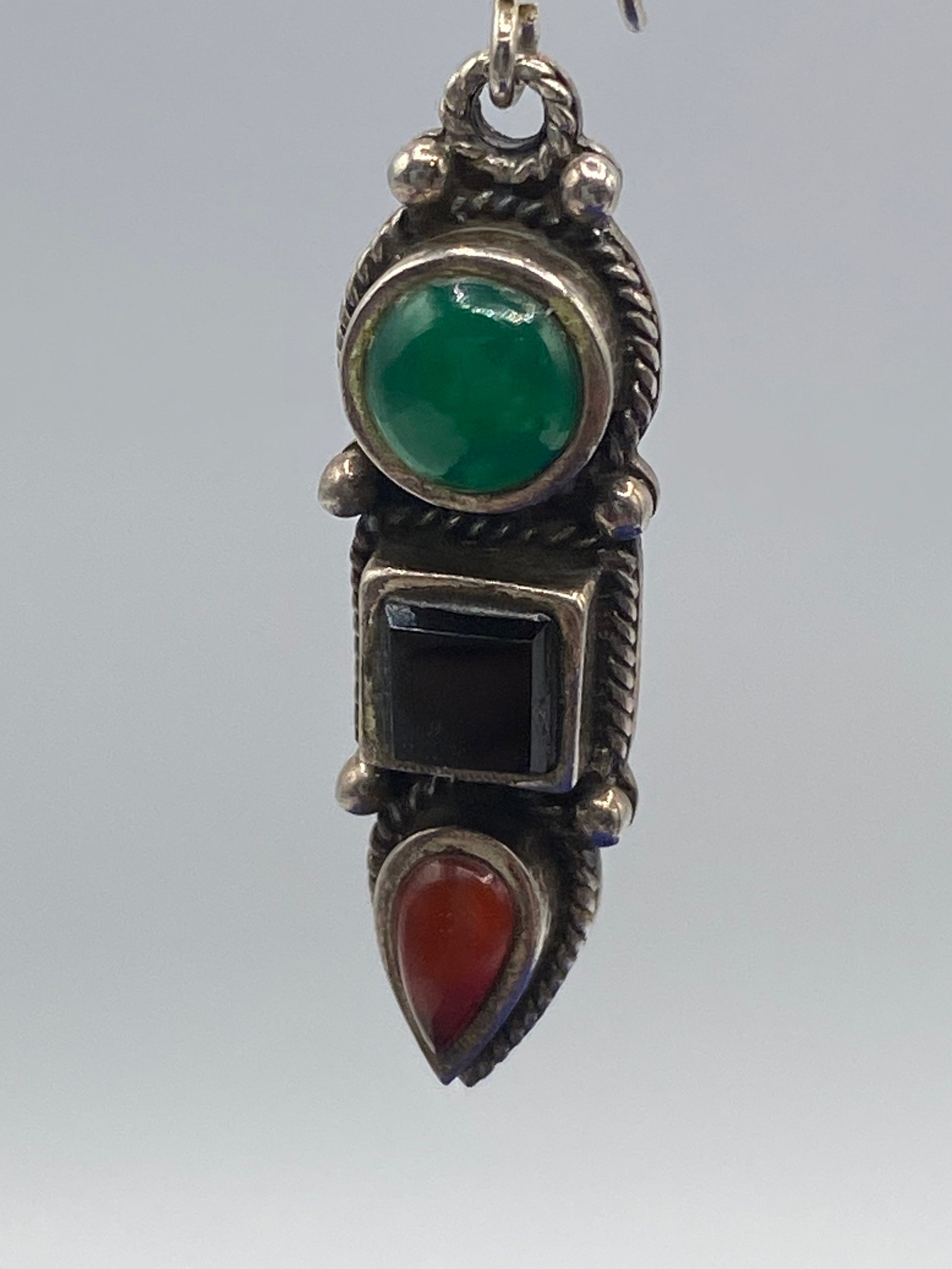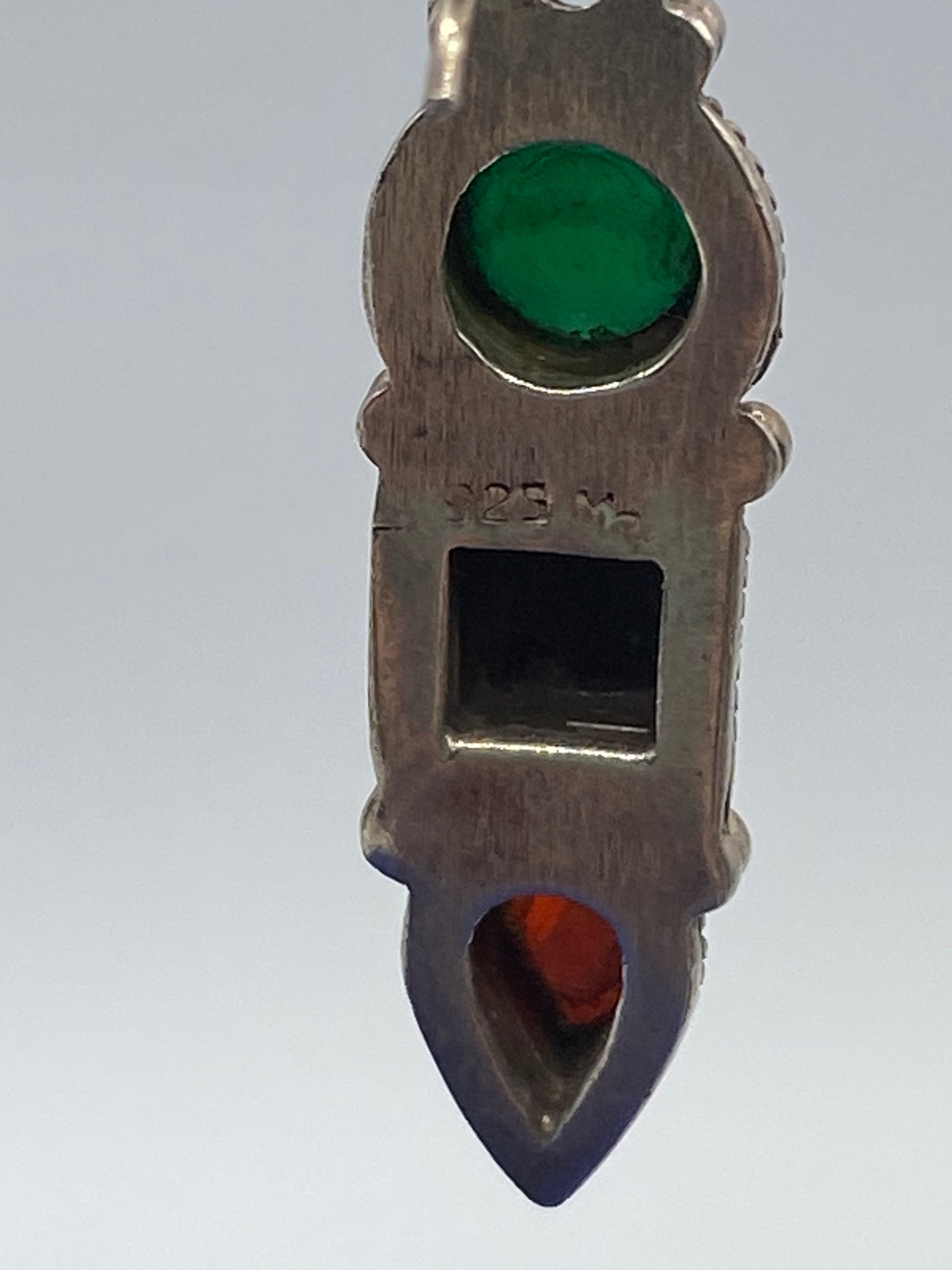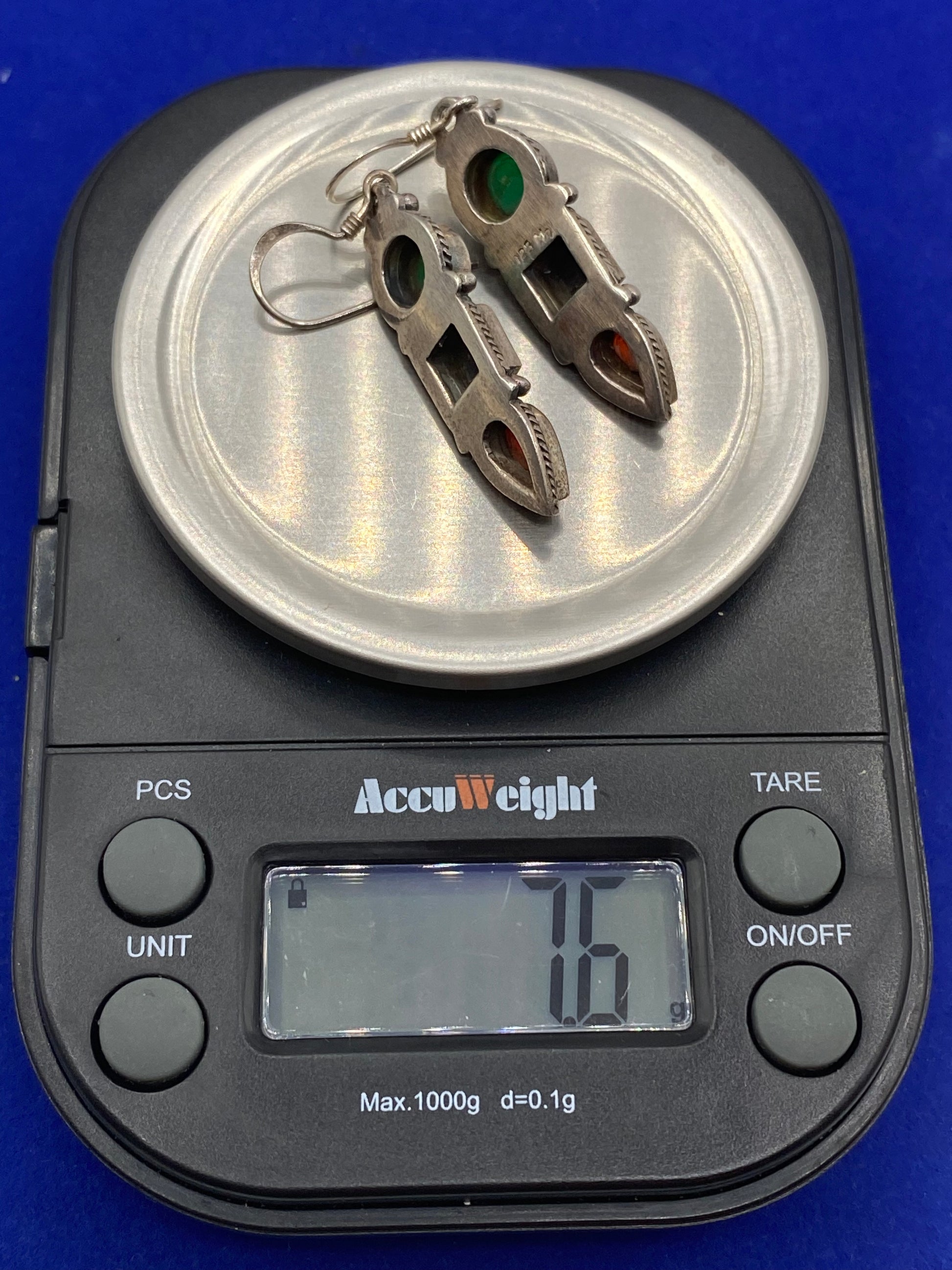 Crafted from high-quality sterling silver, these dangle earrings feature an array of colorful gemstones that are sure to add a touch of elegance to any outfit. The earrings are marked with "925 MP" to signify their genuine sterling silver composition. Elevate your style with these stunning and versatile earrings.