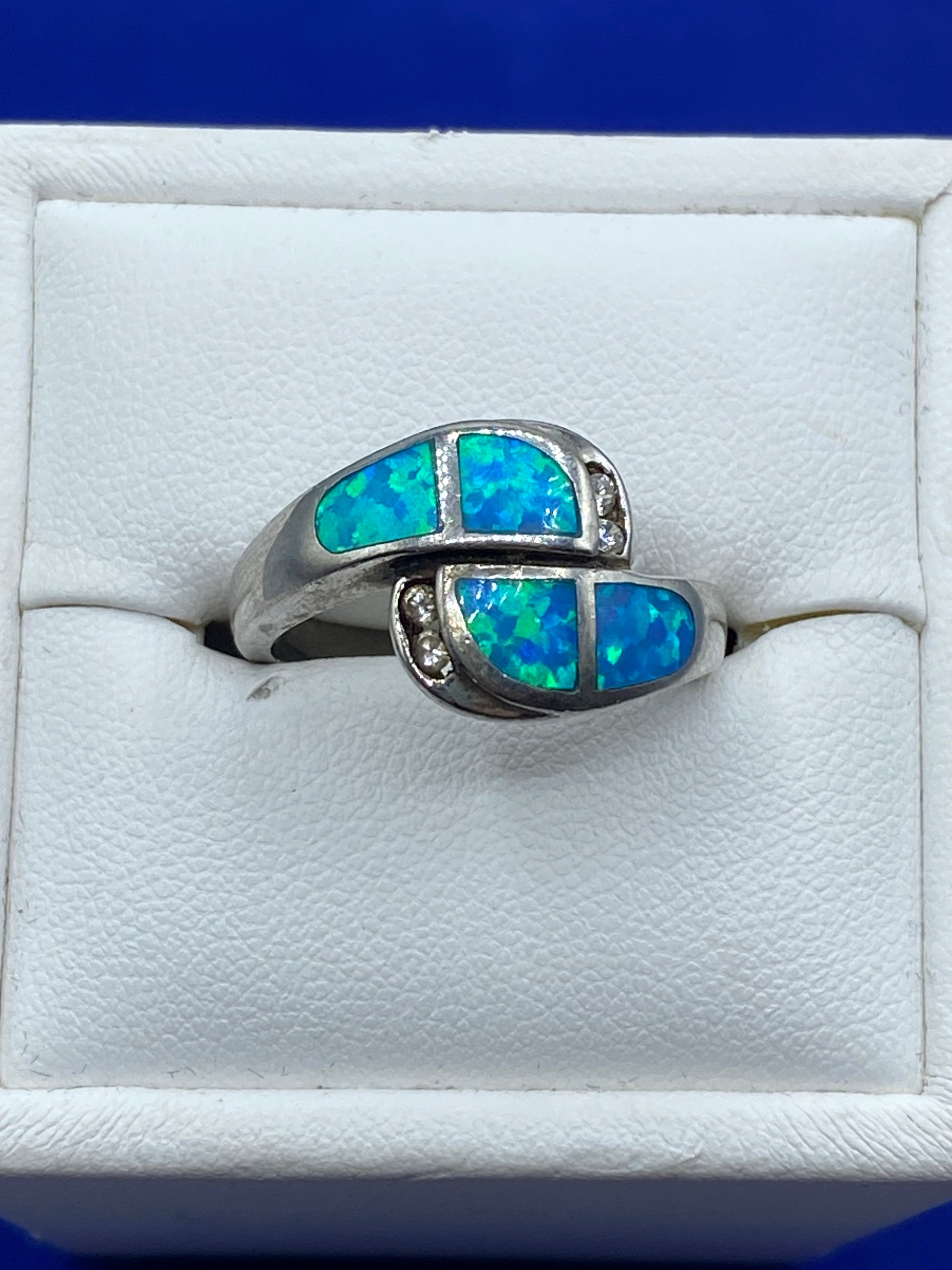 Expertly crafted with sterling silver, this ring features a mesmerizing opal and sparkling cubic zirconia stones. It's marked with "Sterling AK" and is available in size 8.25. Elevate your style with this stunning statement piece.