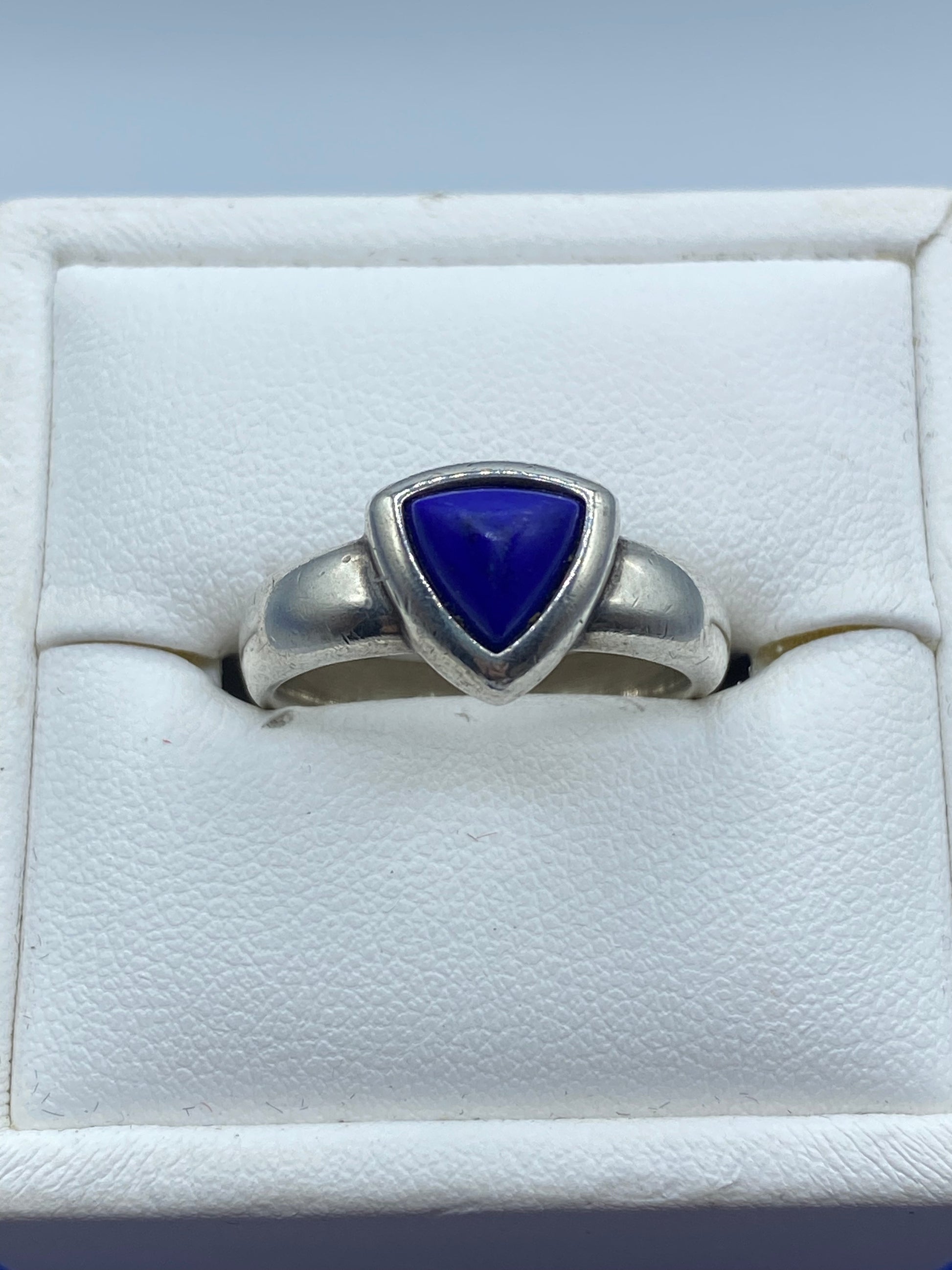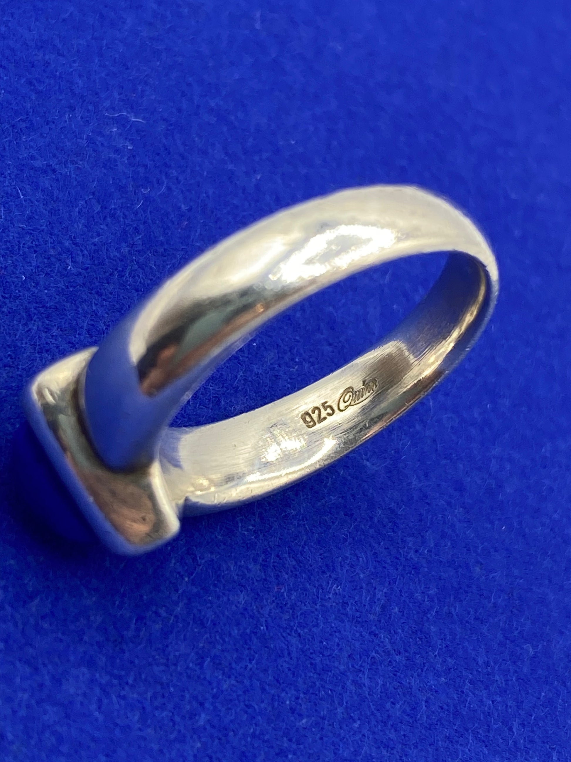 This Sterling Silver Quinn Lapis Ring is marked "Quinn 925" and is a size 7.5. Made of high-quality sterling silver, this ring is not only stylish but also durable. The stunning lapis stone adds a pop of color and sophistication to any outfit. Perfect for daily wear or special occasions.