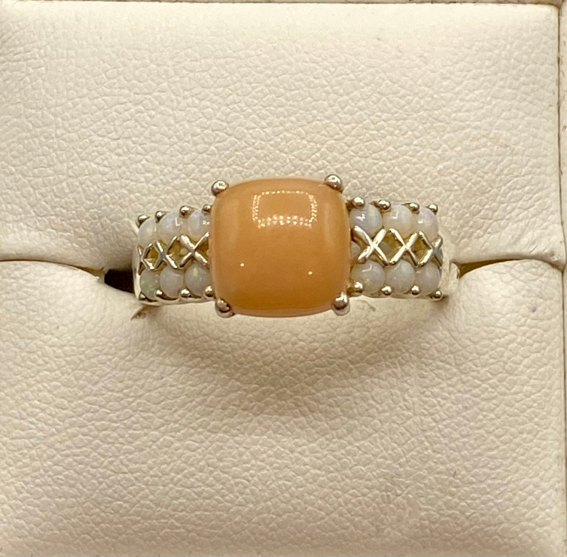 Expertly crafted and uniquely designed, our Sterling Silver Rhodium Flashed Ring features a stunning Square Cabochon Beige Stone with Opal Accents. Weighing 4.6 grams and available in size 8, this ring is a statement piece that combines elegance and durability. Elevate your style with this must-have accessory.