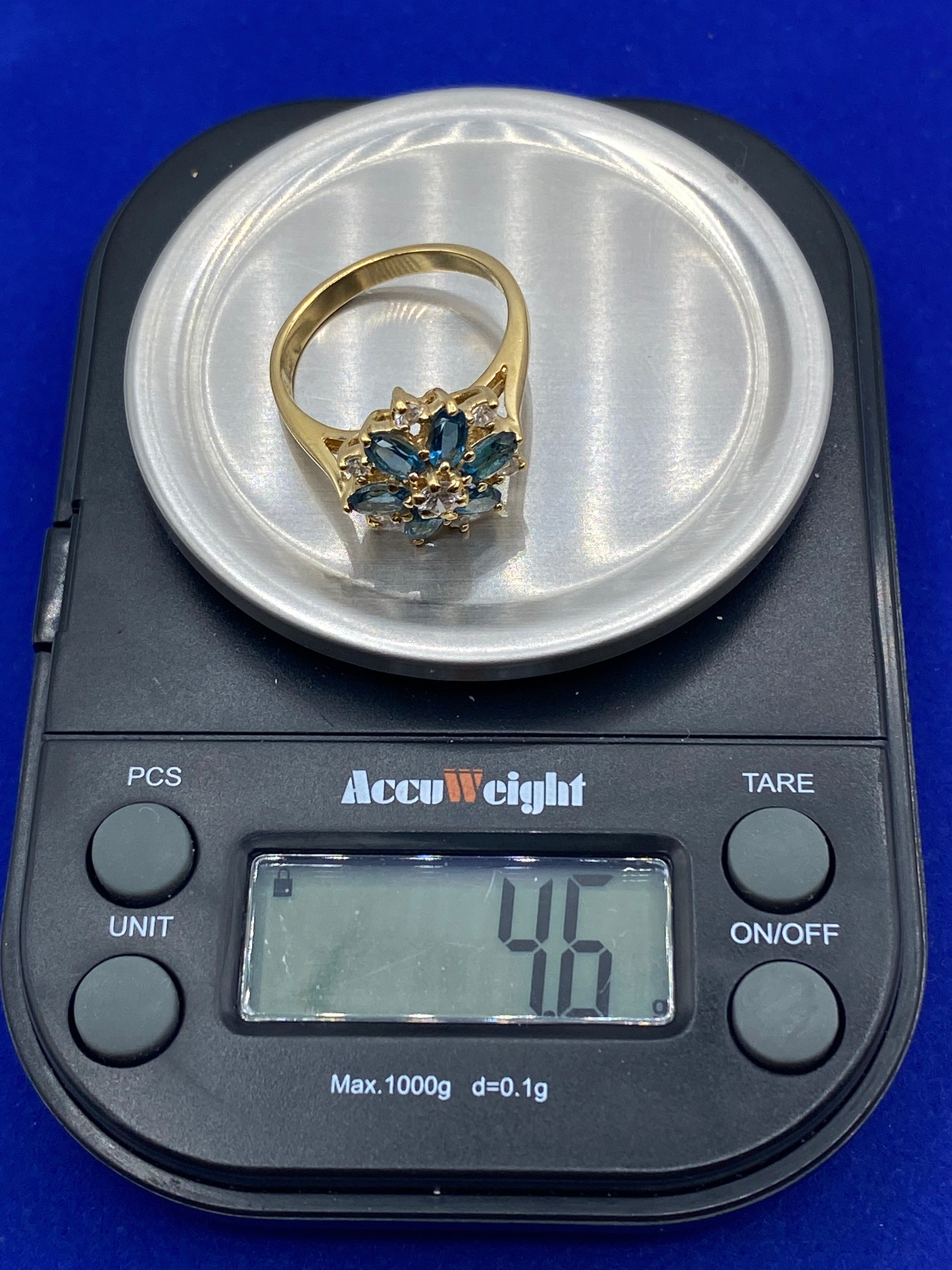 All gemstones have been tested with a Presidium Gem Tester. The ring weighs about 4.6 grams.