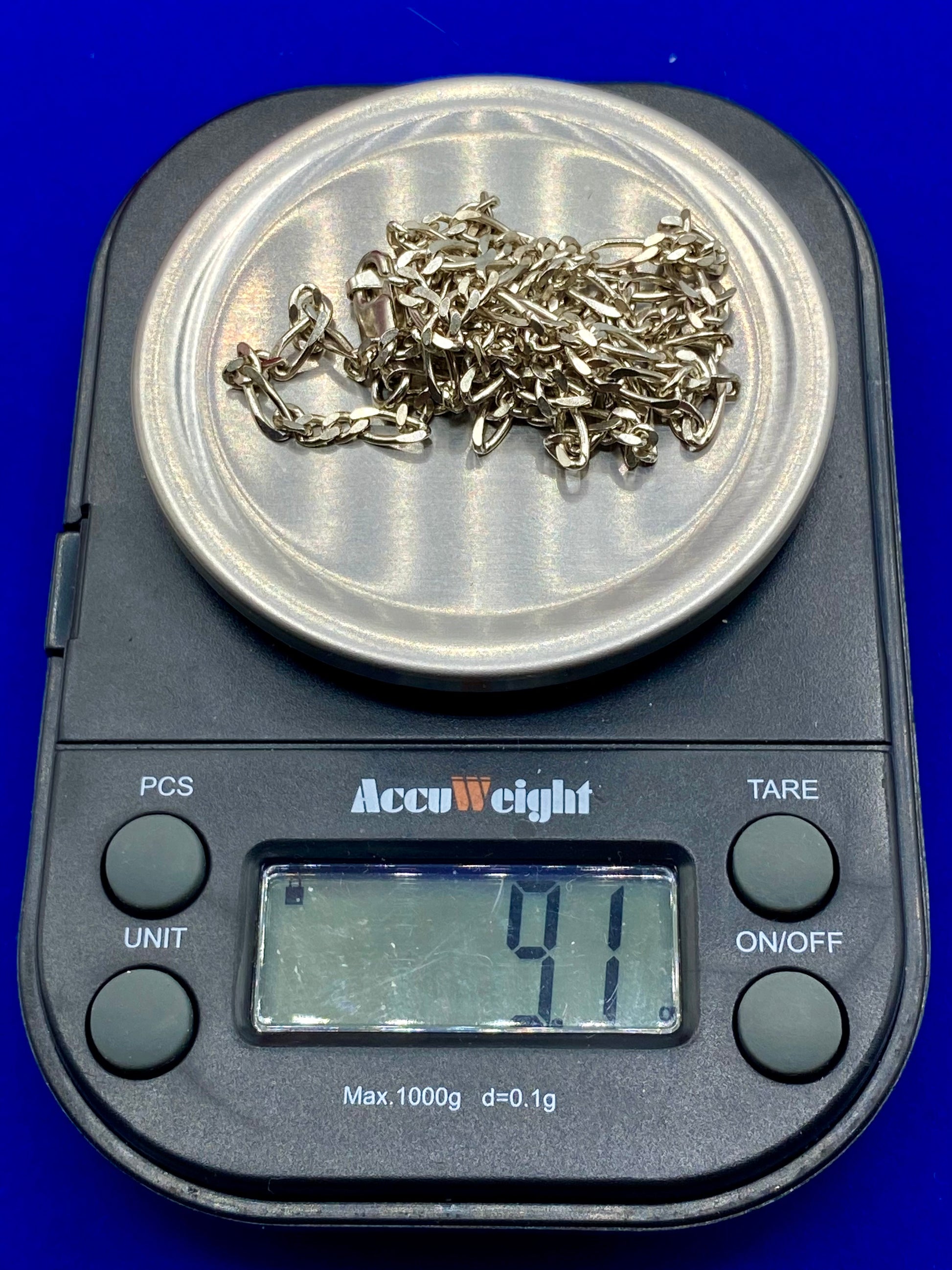 Crafted from high-quality sterling silver, this thin Figaro chain necklace weighs 9.1 grams and measures 22 inches long. Its intricate design offers a touch of elegance to any outfit, while its lightweight nature ensures comfort throughout the day. A must-have for any jewelry collection.