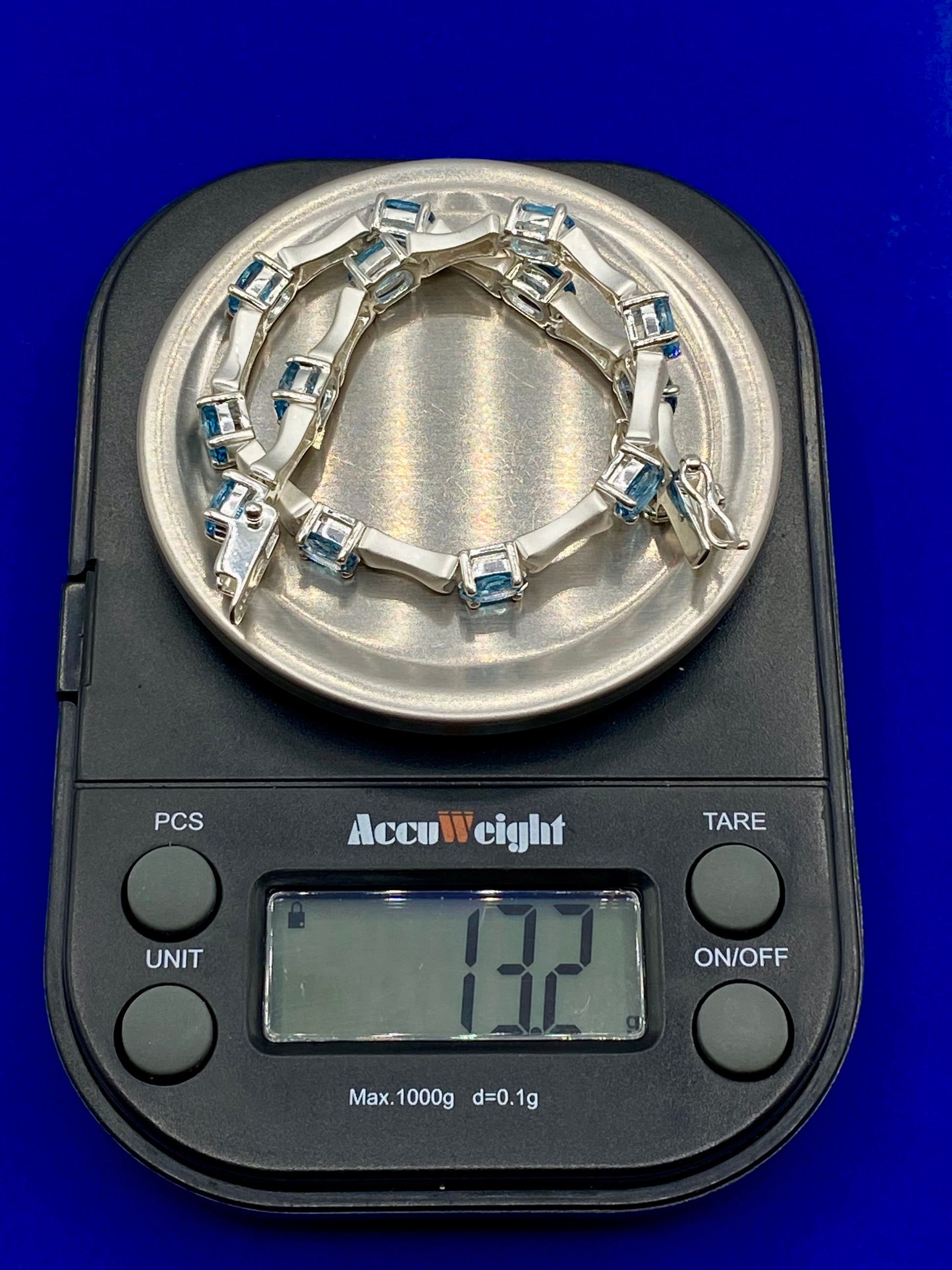 Expertly crafted with high-quality sterling silver, this tennis bracelet features sparkling topaz stones that catch the light with every movement. Weighing 13.2 grams, and measuring 7 inches in length, it's the perfect accessory for any occasion, adding a touch of elegance and sophistication to your look.