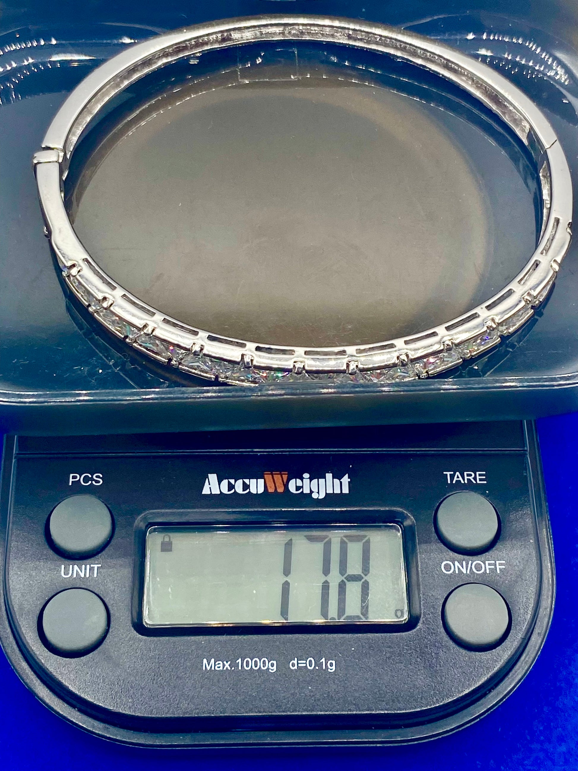 This Sterling Silver Trillion Cut CZ Bangle Bracelet is a must-have for any jewelry collection. Made of high-quality sterling silver, this bracelet features a stunning trillion-cut cubic zirconia. With a size 7 fit and weighing 17.8 grams, it is lightweight and comfortable to wear. Enhance any outfit with this elegant and timeless piece.