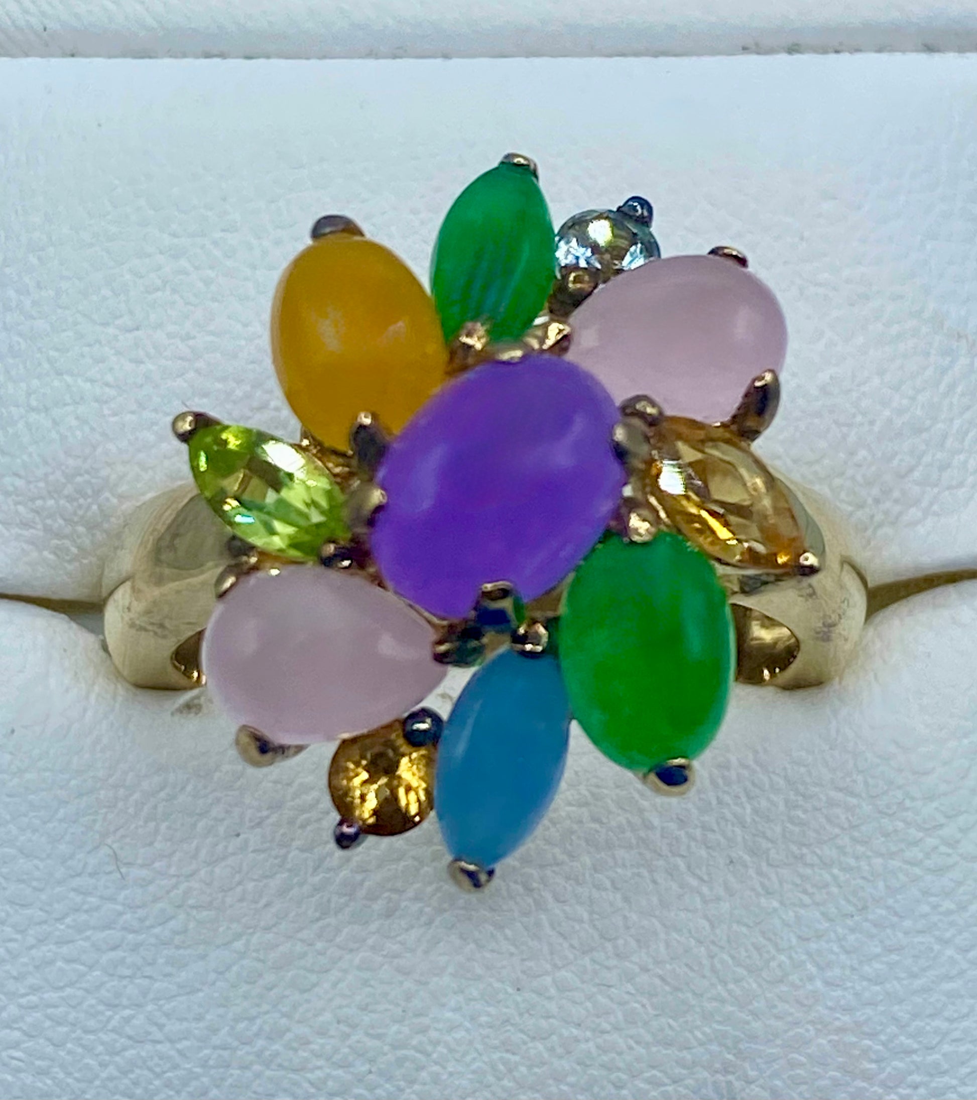 Crafted from high-quality sterling silver vermeil, this stunning ring features a beautiful combination of multi-color jade and gemstones, including citrine, topaz, and peridot. Weighing 9.4 grams and boasting a size 10, this ring is the perfect addition to any outfit, adding a touch of elegance and sophistication.