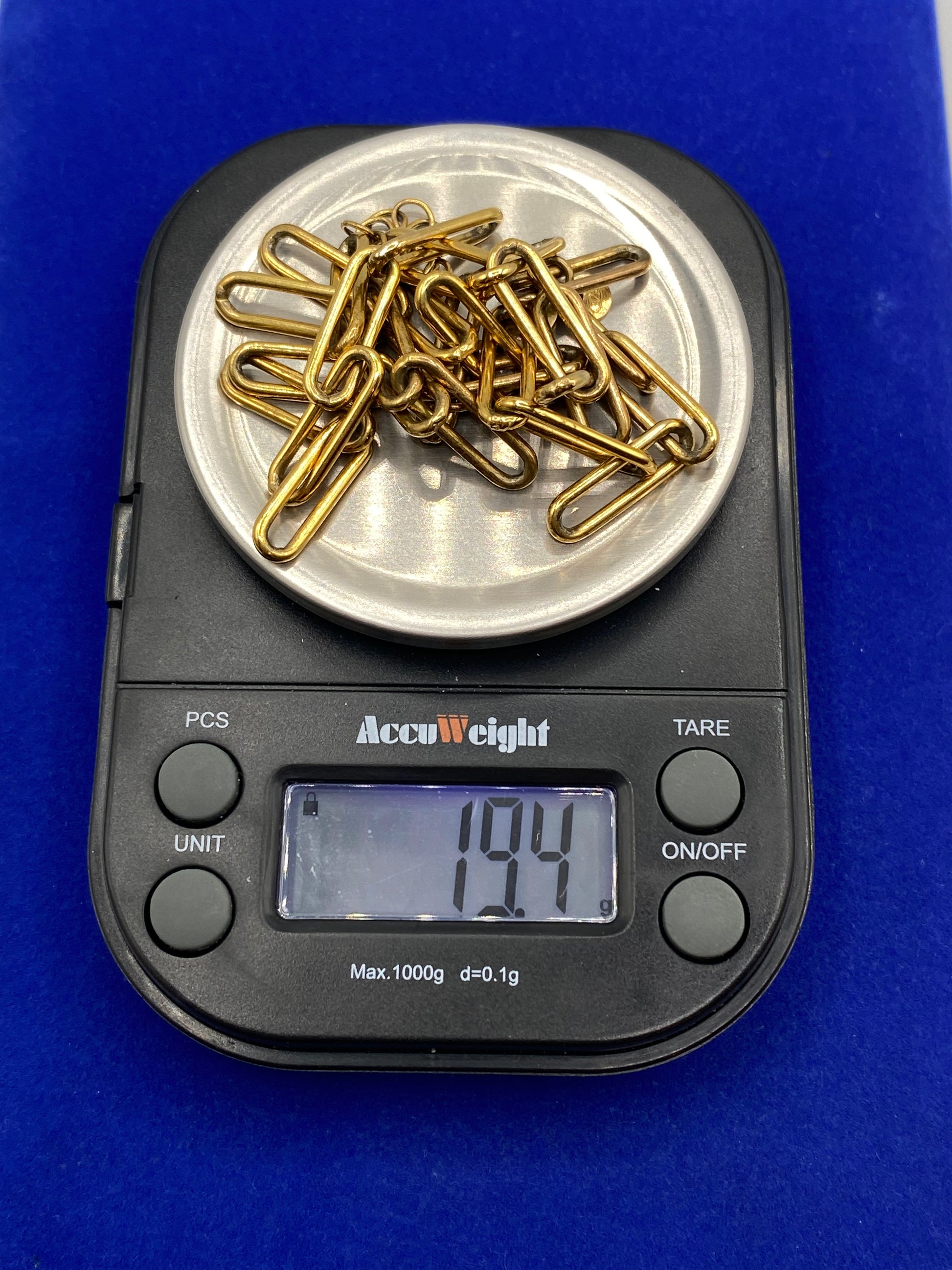 The chain is about 16-18 inches long depending on extender and weighs about 19.4 grams. Some signs of wear on some of the links.