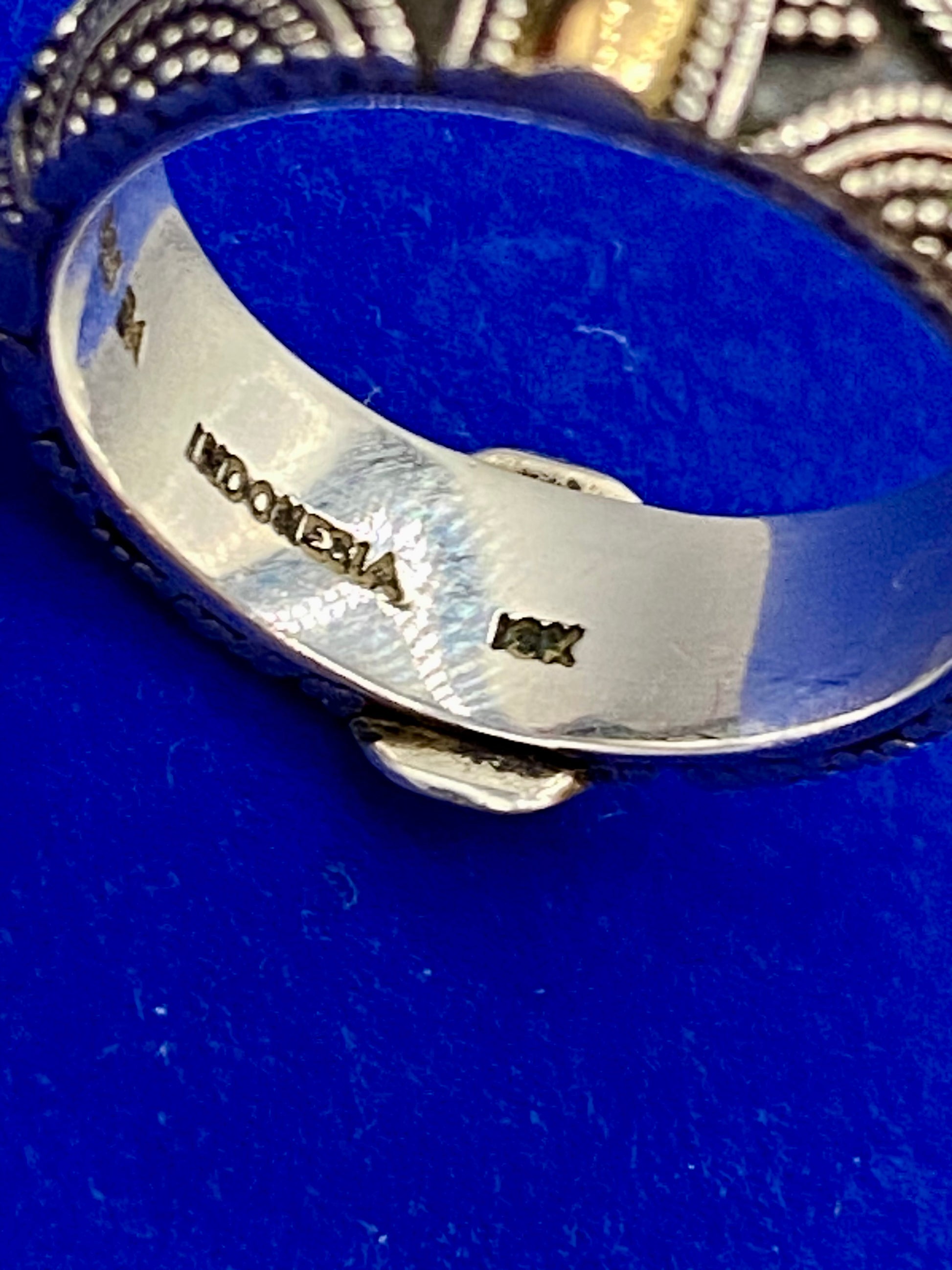 This SUARTI BA Bali 18k Gold & Sterling Silver Scroll Cigar Band Ring is a stunning piece to add to your collection. Crafted with 9.6 grams of both gold and sterling silver, this size 10 ring boasts a unique scroll pattern that exudes elegance and sophistication. Make a statement with this luxurious piece.
