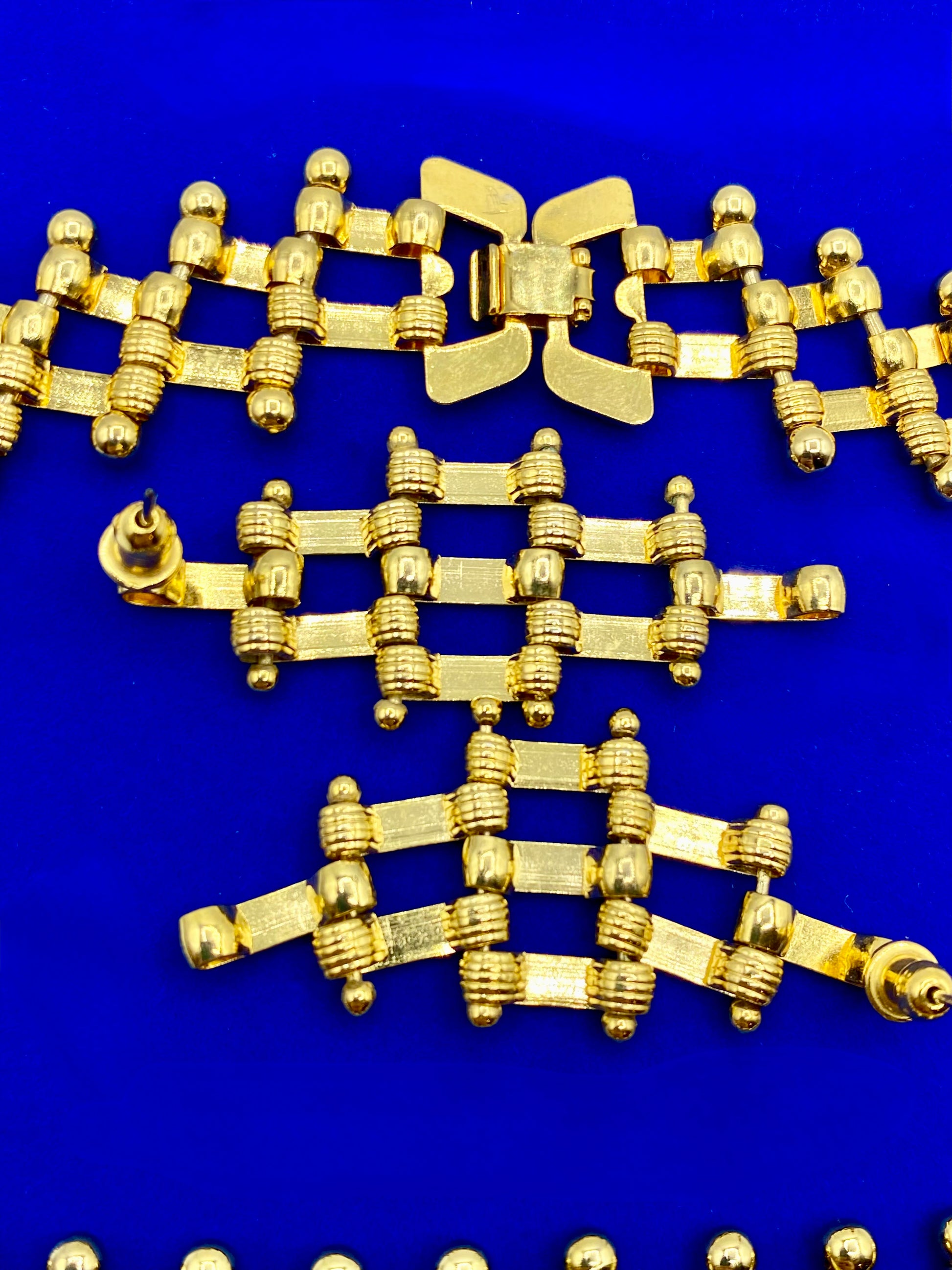 As a vintage gold tone jewelry set, this piece exudes timeless elegance. The necklace, measuring 14 inches, adds a touch of sophistication to any outfit. The accompanying 2 inch earrings complete the set and add a subtle yet striking accent. A must-have for any jewelry collection.