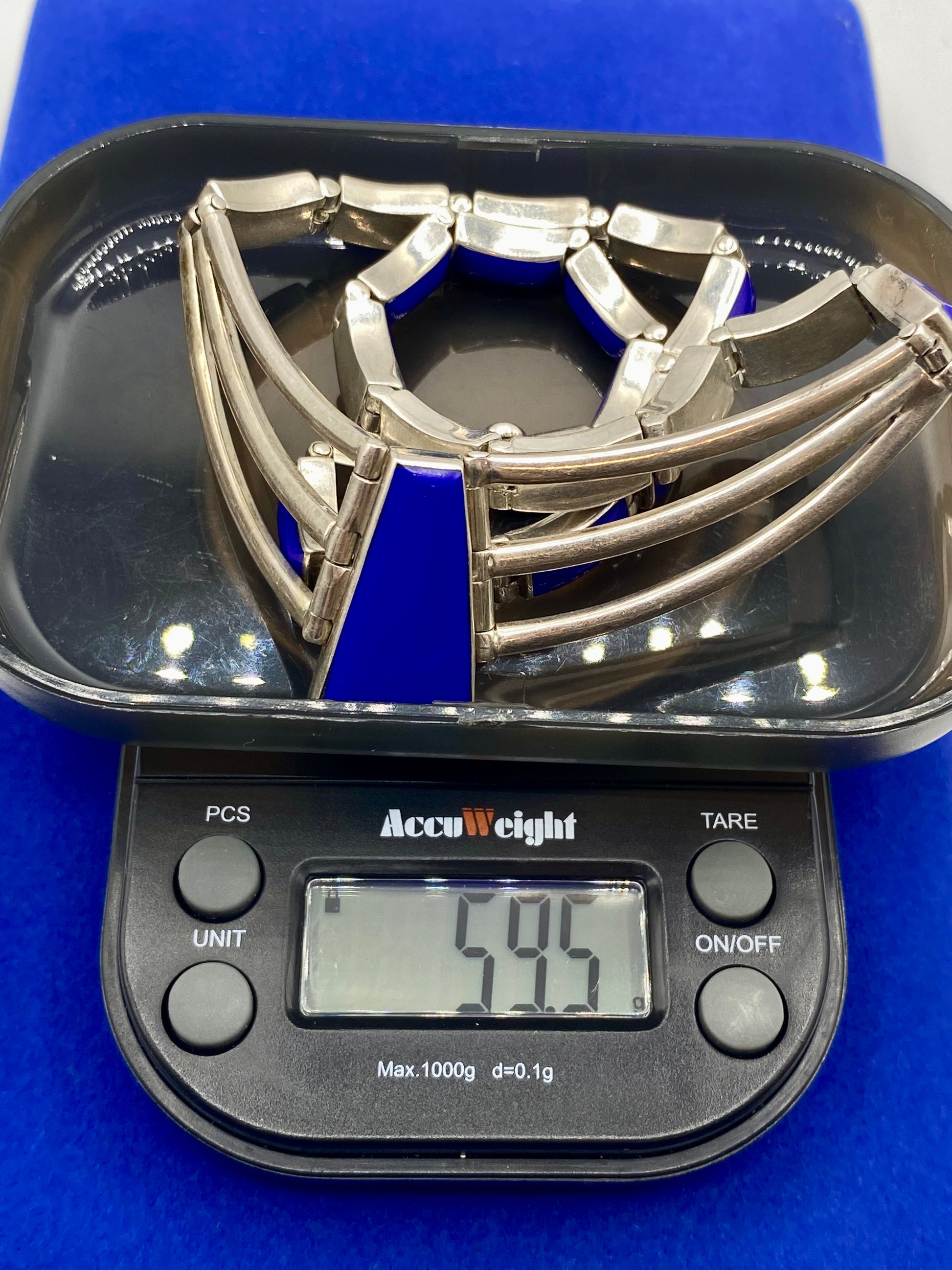 This exquisite Vintage Lapis Lazuli 950 Silver Choker Necklace weighs 59.5 grams and measures 12 inches in length. Crafted with high-quality materials and featuring a stunning Lapis Lazuli gemstone, this necklace is the perfect statement piece for any formal occasion. Enhance your jewelry collection with this timeless and elegant piece.