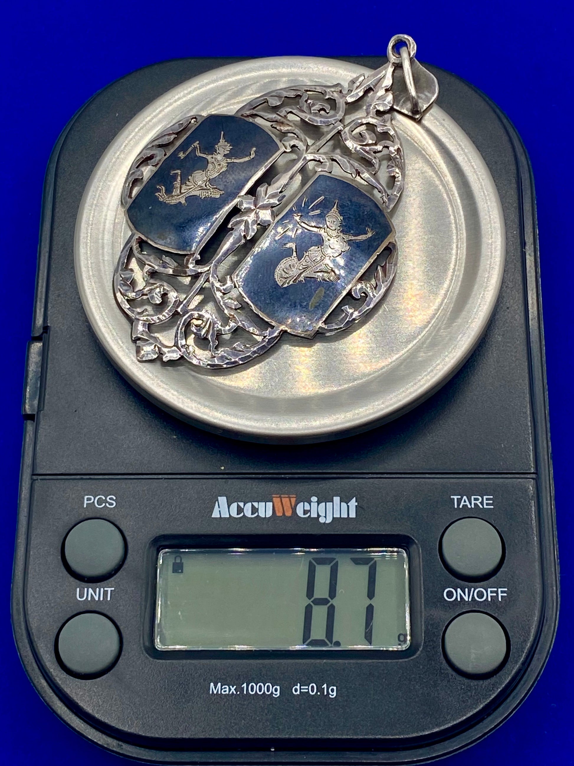 This vintage Siam Sterling Silver Pendant weighs 8.7 grams with a length of 2 inches. Made with high-quality sterling silver, it showcases a beautiful vintage design. A timeless piece that adds elegance to any outfit with its unique craftsmanship and intricate details.