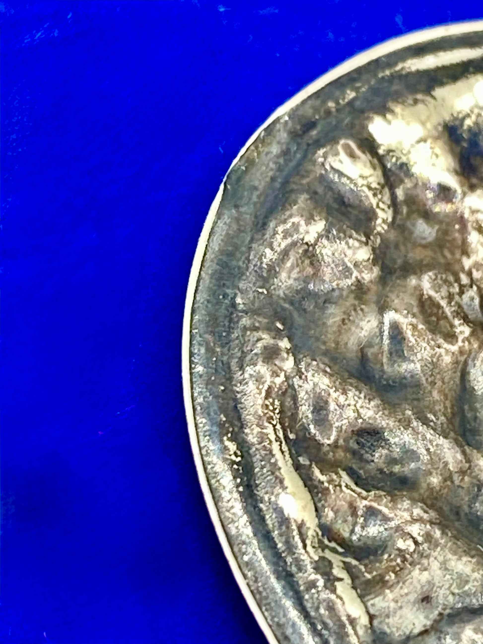 This vintage silver plate brooch from Denmark features a beautiful whitetail deer design. The brooch is approximately 2.5 inches long, making it a stunning and eye-catching accessory. A must-have for any vintage jewelry lover or nature enthusiast. Please note there is a small dent at the top of the brooch.