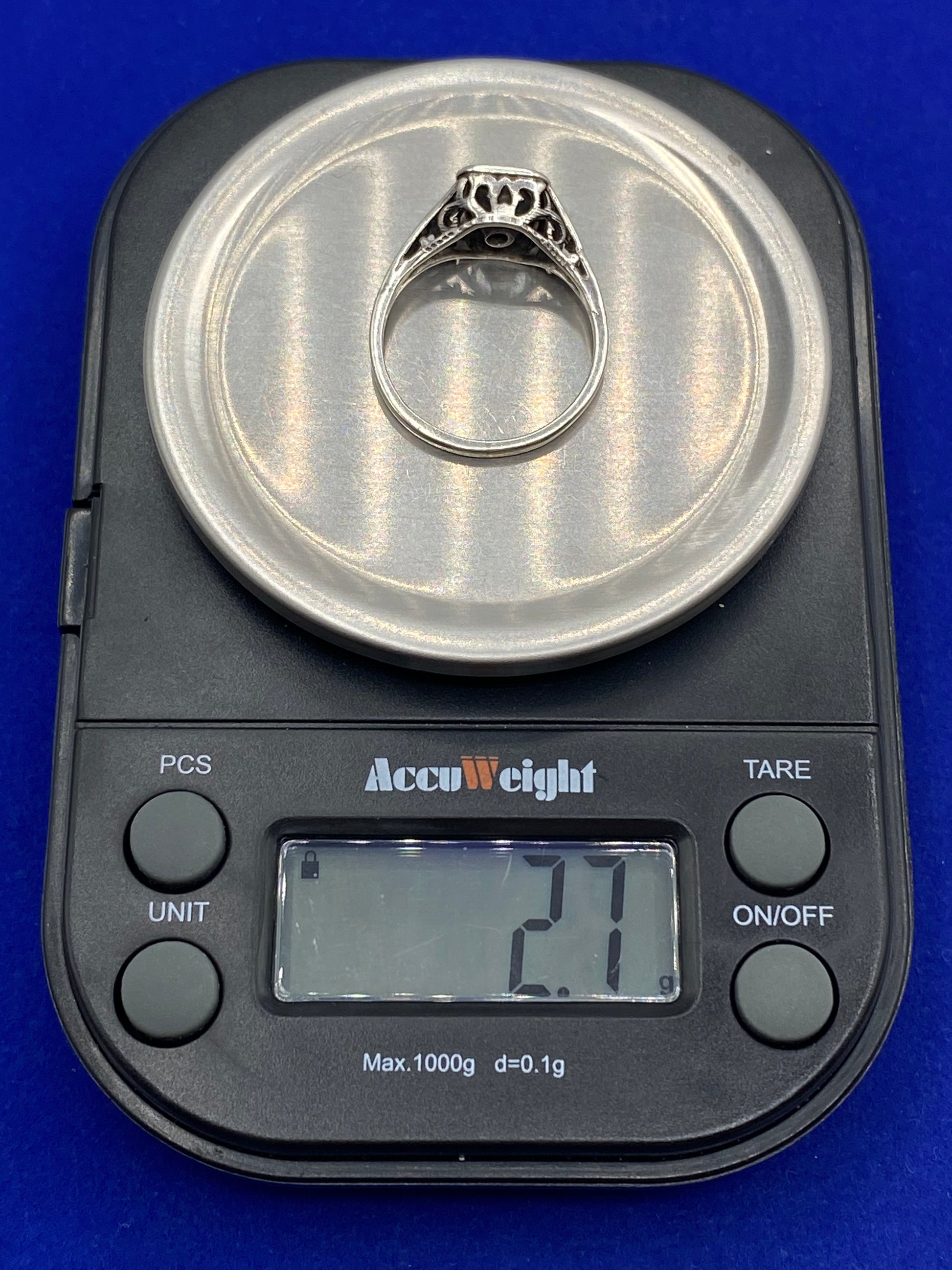 The ring weighs about 2.7 grams. The center glass stone needs a little cleaning and is a little cloudy.