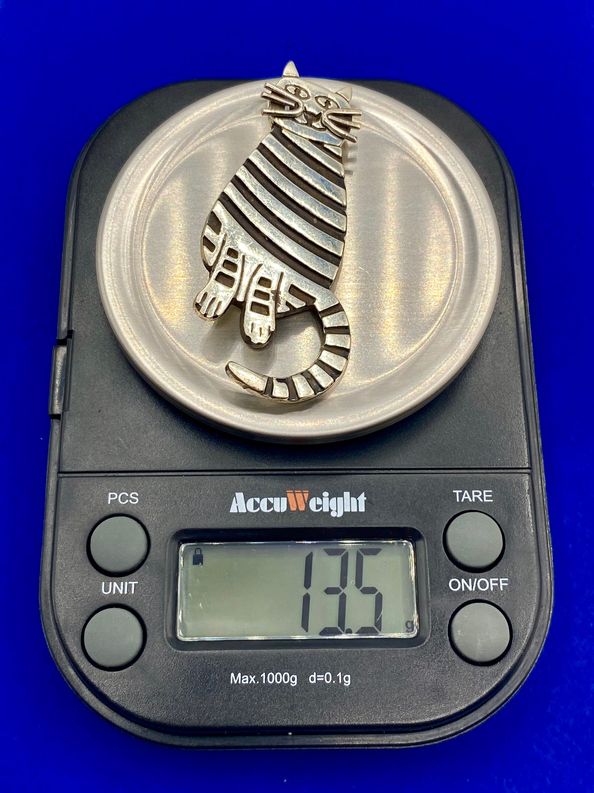 This Vintage Sterling Silver Cat Brooch is a stunning piece of jewelry that weighs 13.5 grams and measures 2 inches long. Made from high quality sterling silver, this brooch is a timeless accessory that will add a touch of elegance to any outfit. Its intricate design and craftsmanship make it a must-have for any cat lover.