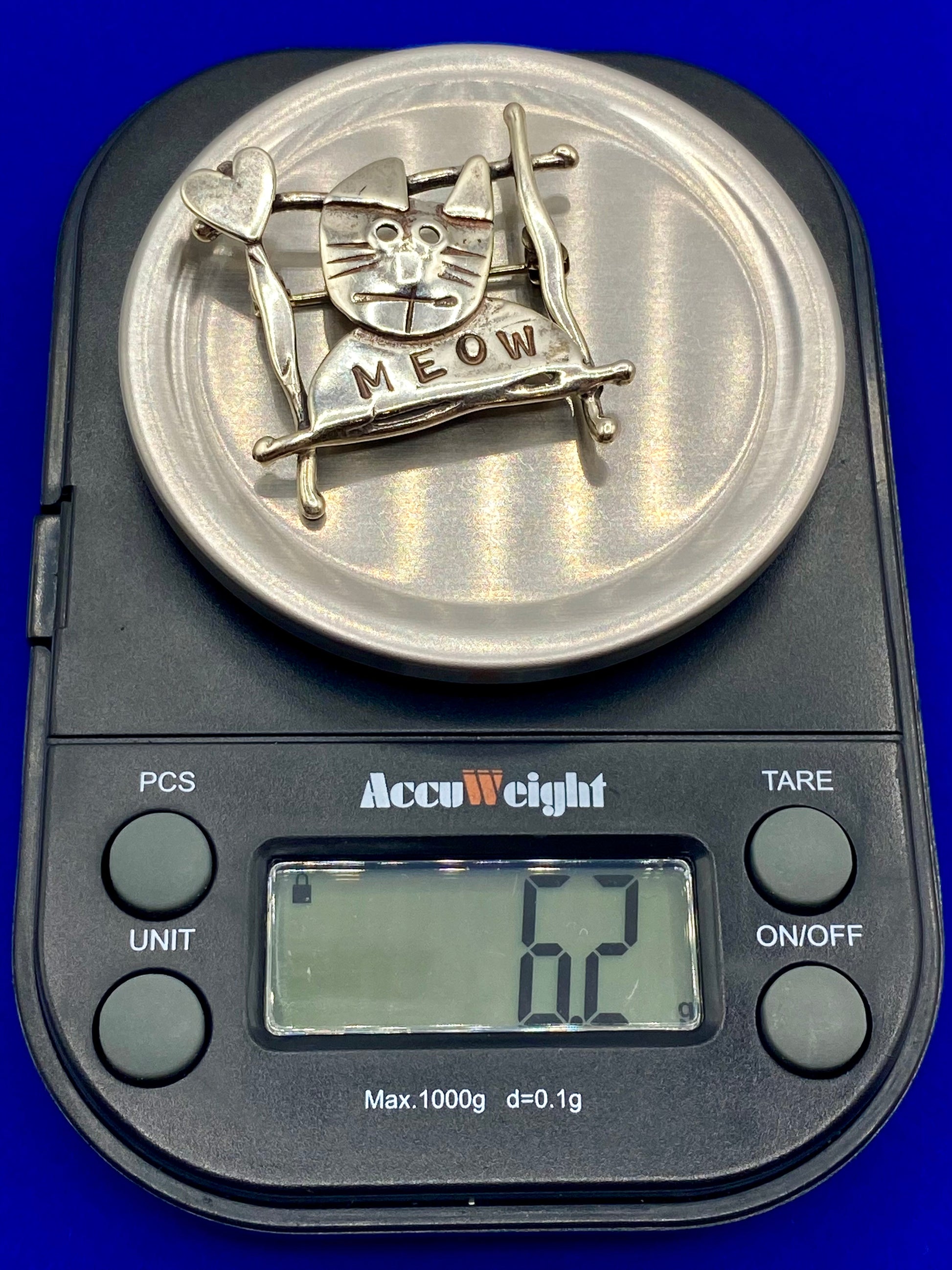 This vintage sterling silver cat brooch weighs 6.2 grams and measures an inch in length. The intricate silver design adds timeless elegance to any outfit, while the lightweight construction ensures comfortable wear. A must-have for any cat lover or collector of vintage jewelry.
