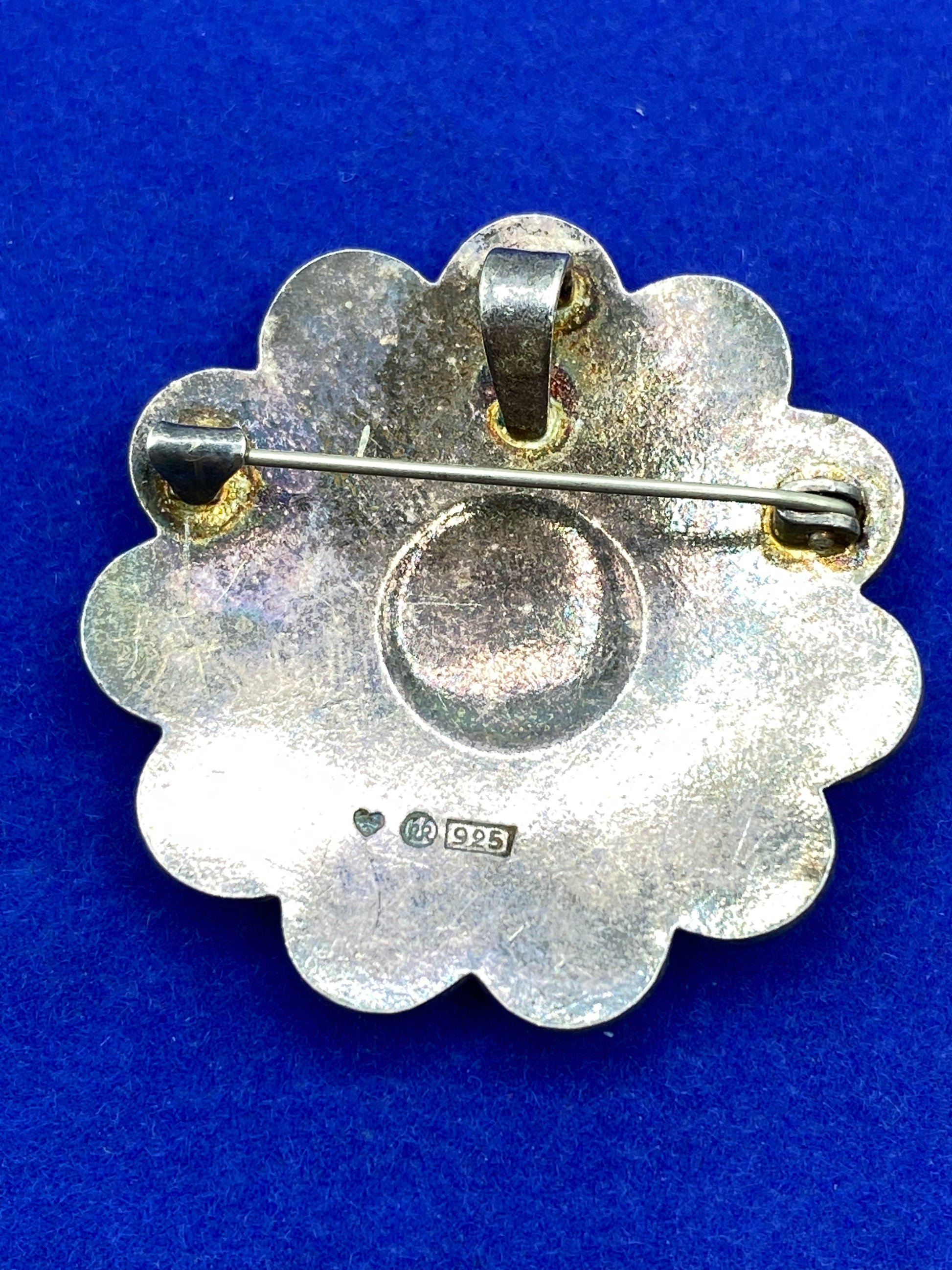 This vintage sterling silver enamel flower brooch, marked RR 925, exudes timeless elegance. A perfect accessory to add a touch of sophistication to any outfit. Crafted with high-quality materials, this brooch is a beautiful addition to any jewelry collection.