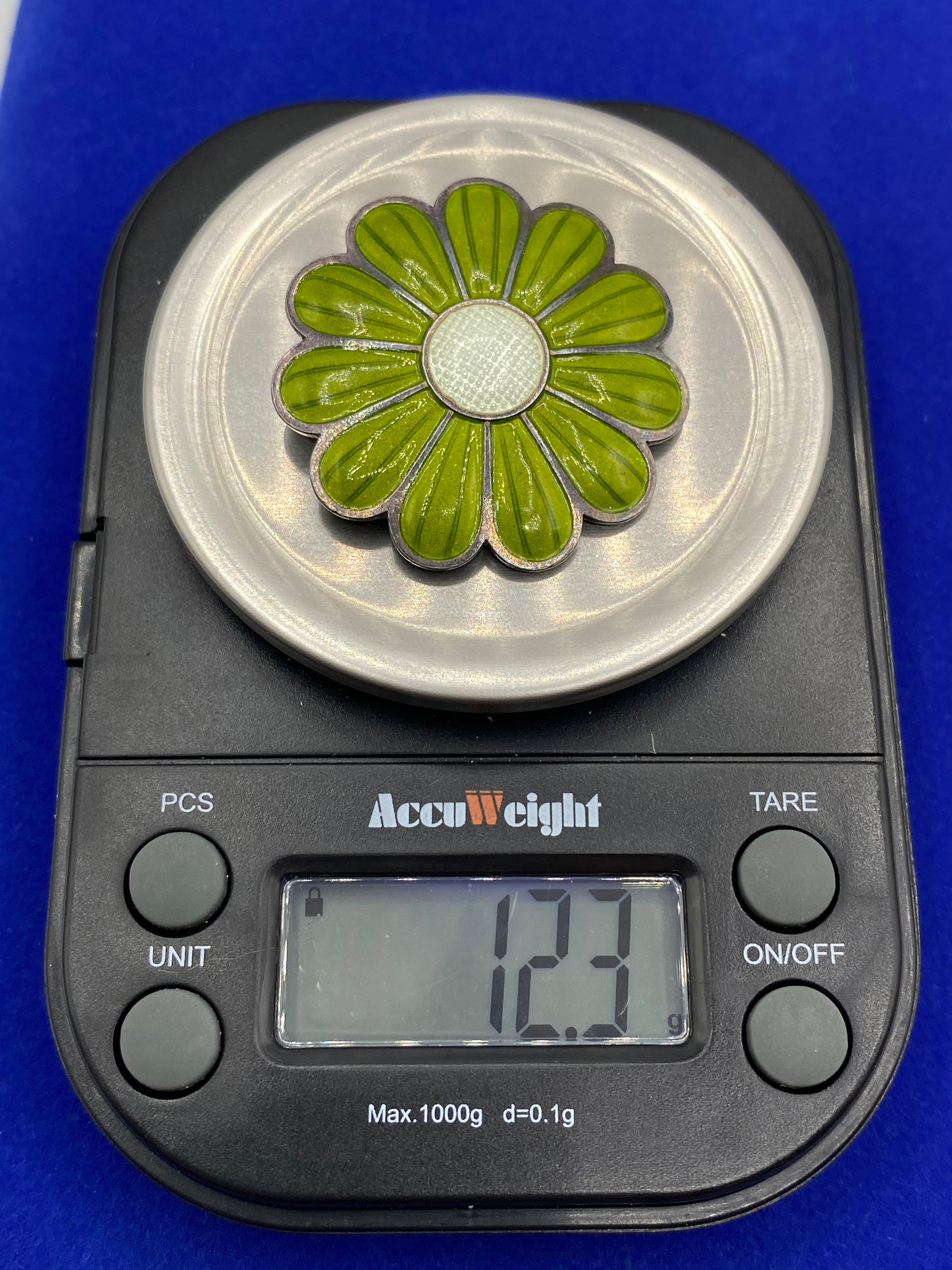 The brooch is about 1.25 inches long and weighs about 12.3 grams.
