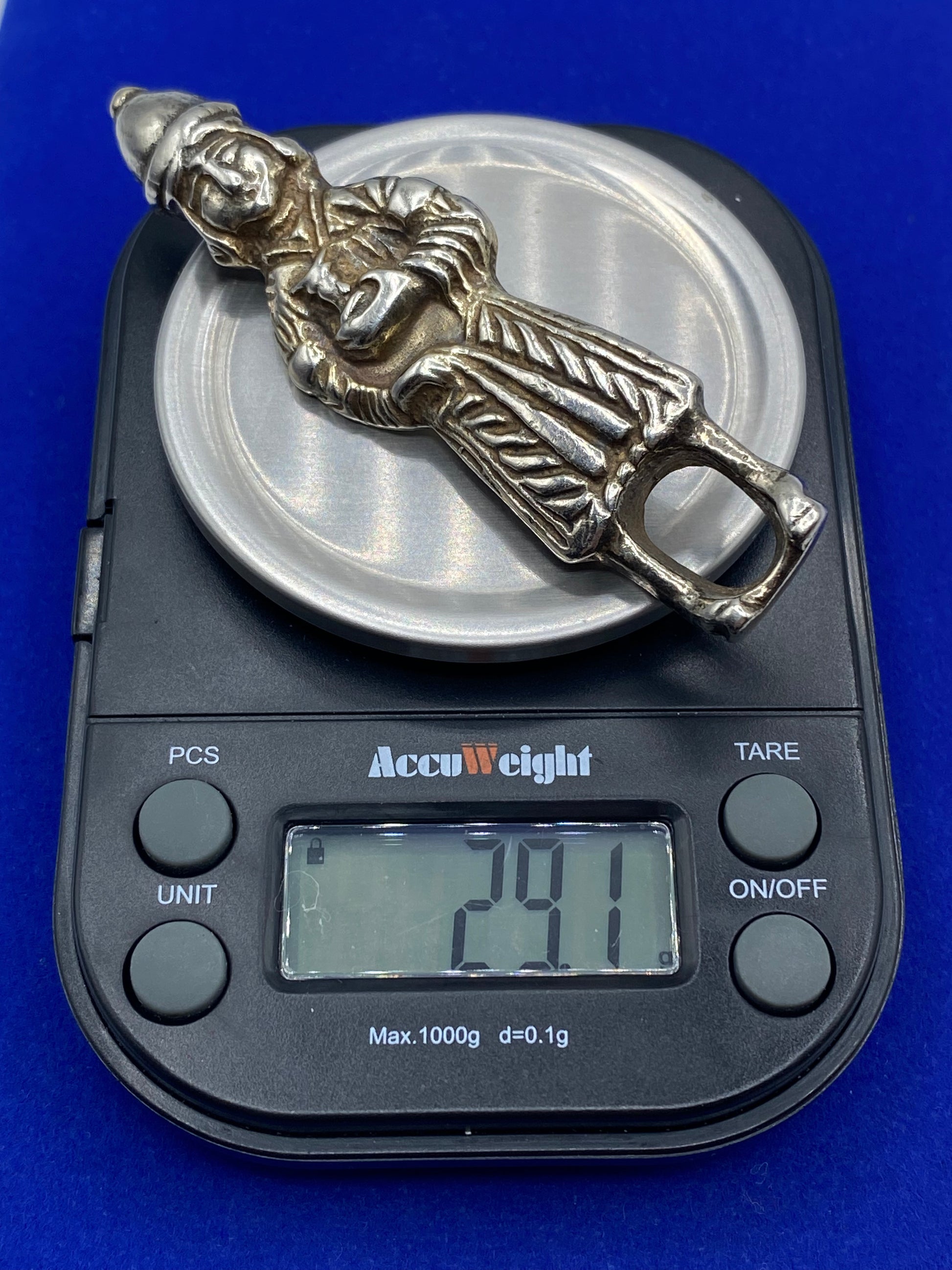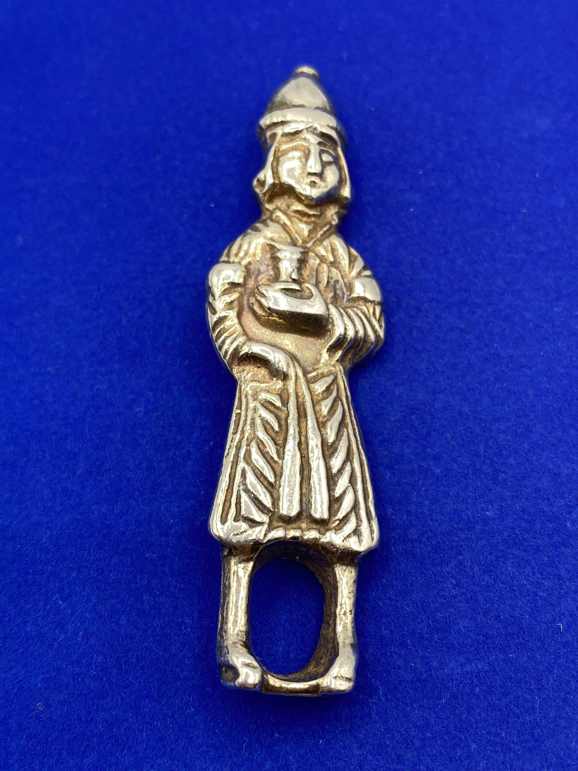 This unique vintage Sterling Silver Figural Pendant & Brooch features a medieval servant design, perfect for history enthusiasts and collectors alike. Made of high-quality sterling silver, this piece is sure to add a touch of elegance and character to any outfit. A perfect addition to any jewelry collection.