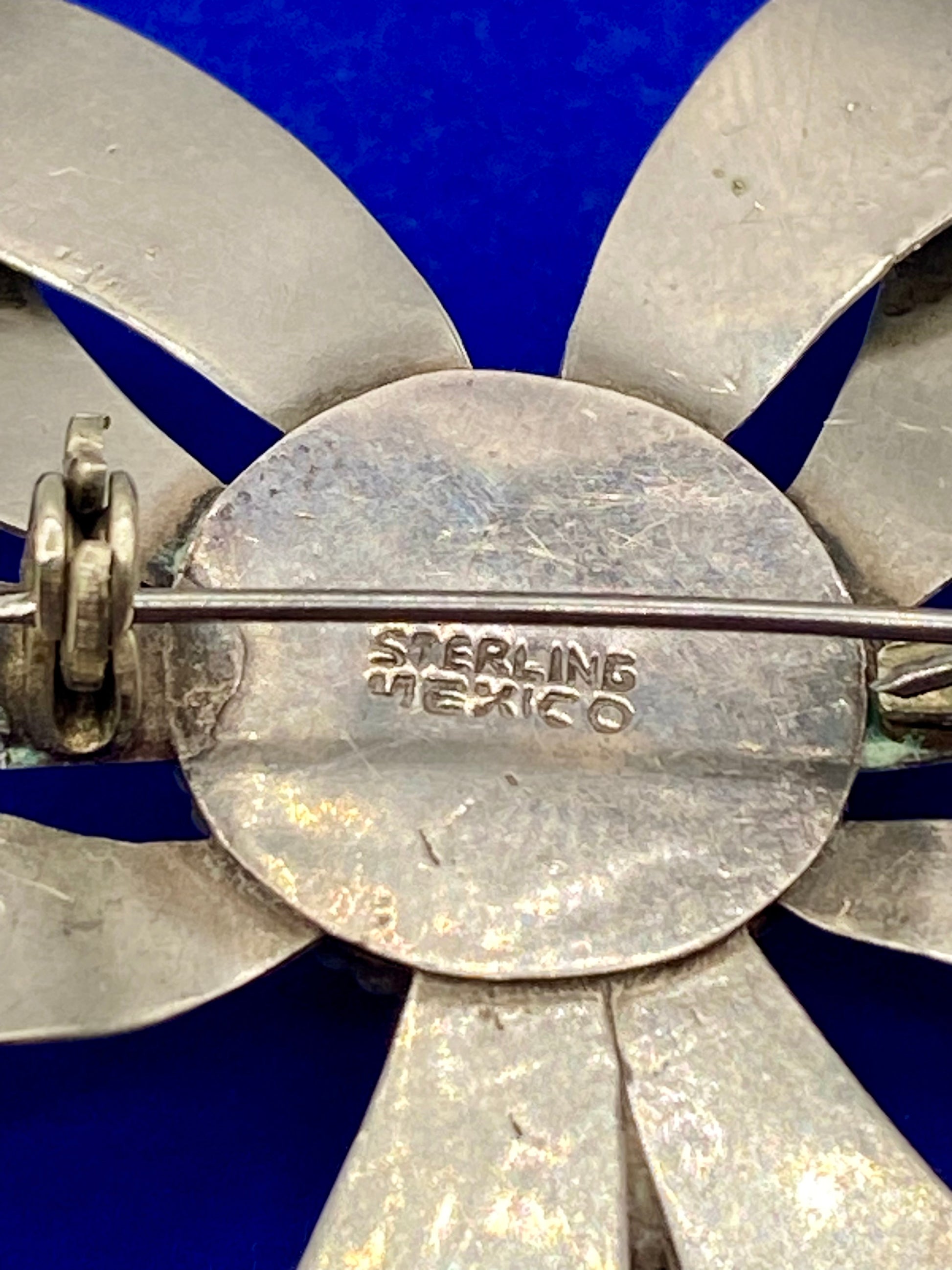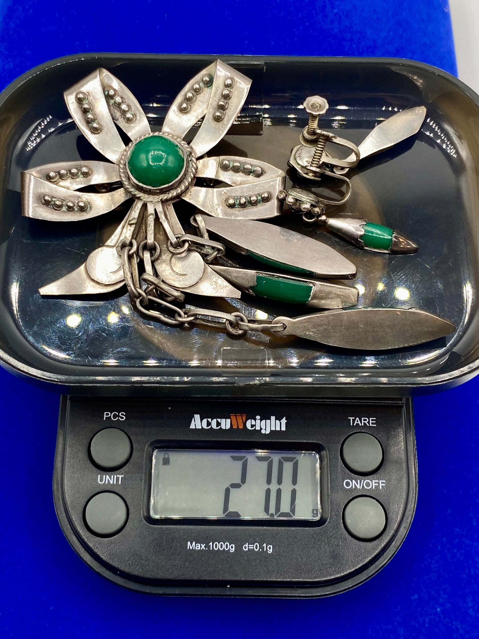 Vintage Sterling Silver Mexico Jade Brooch & Earring Set