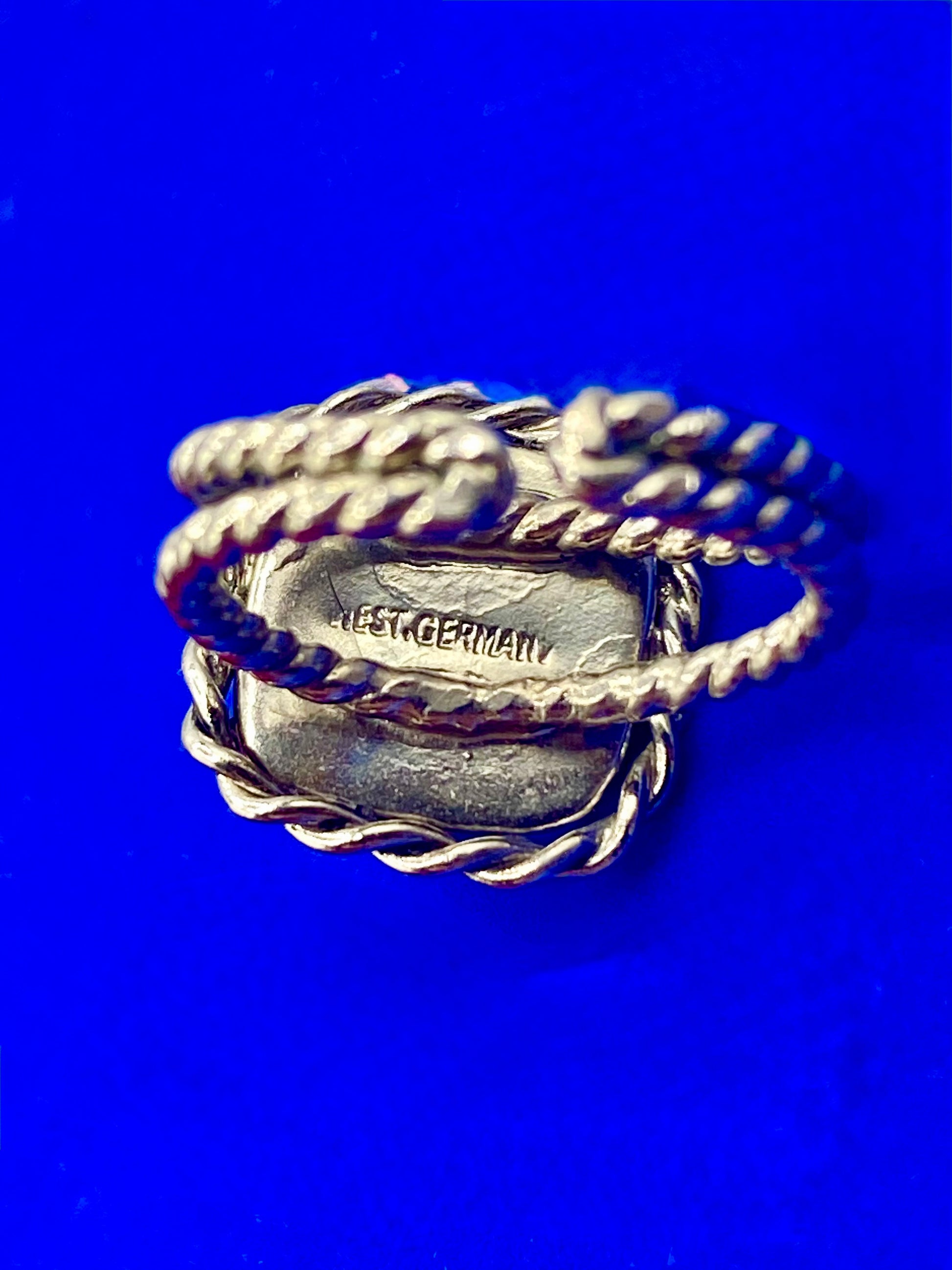 This Vintage West Germany Green Glass Ring, with an adjustable size 7, boasts a unique and timeless design. Crafted with high-quality green glass, it radiates elegance and sophistication. A must-have for those seeking to add a touch of vintage glamour to their jewelry collection.