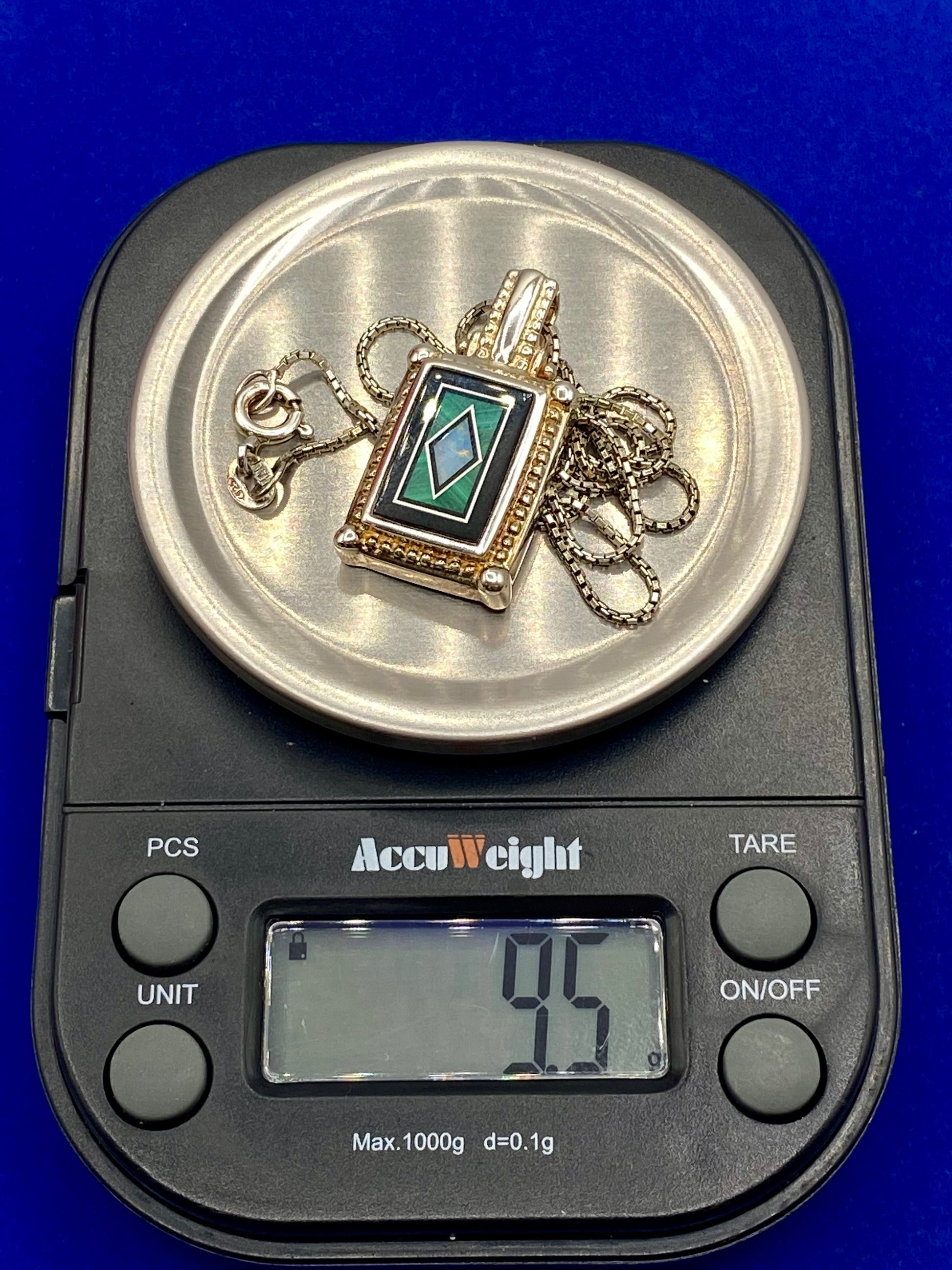 Expertly crafted by Whitney Kelly, this Onyx/Malachite/Opal Sterling Silver Necklace weighs 9.5 grams and measures 18 inches long. The perfect addition to any jewelry collection, this necklace combines elegant design with quality materials for a stunning and versatile piece.